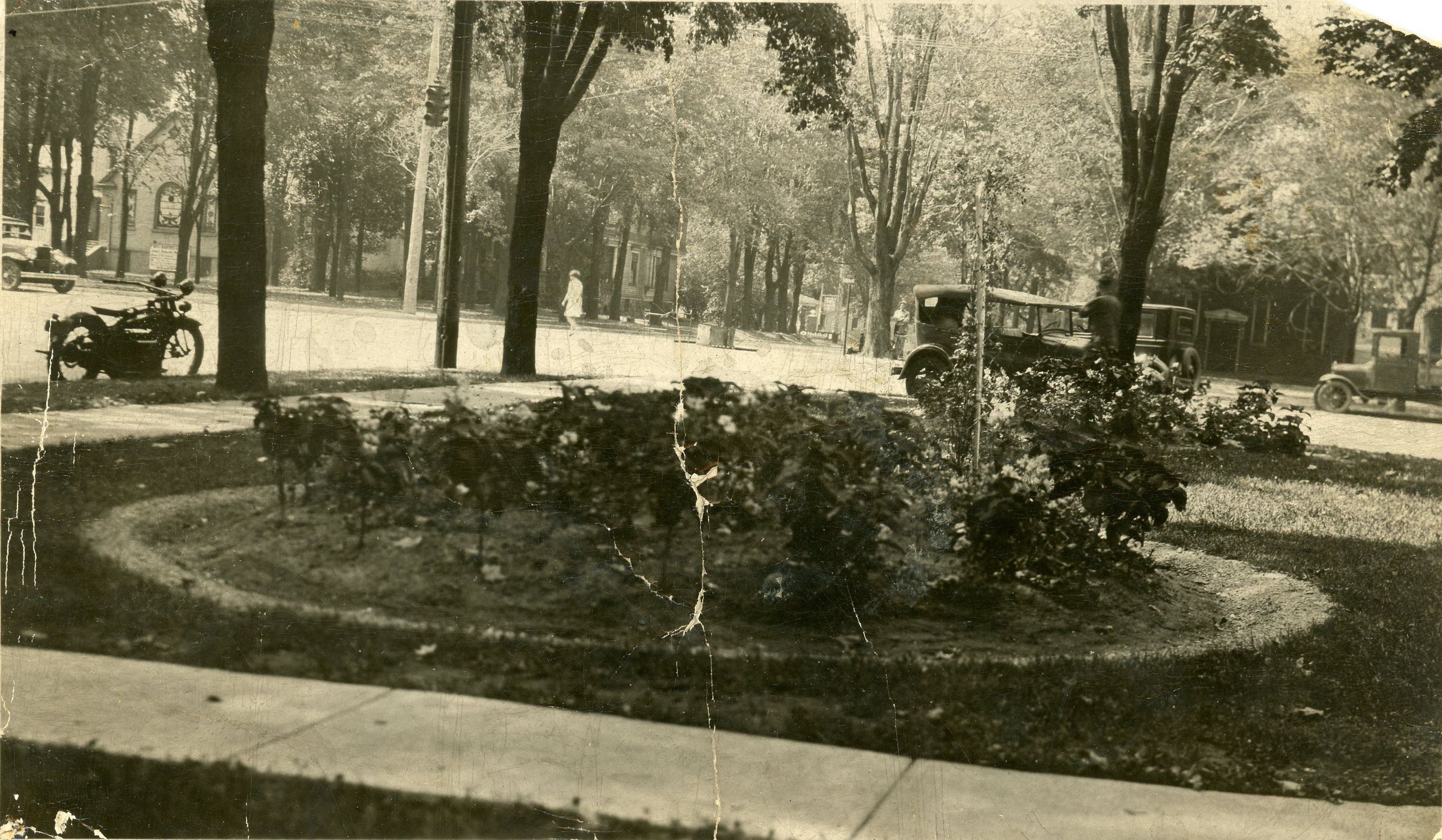 Intersection of Main, Biddle, and Monroe looking West. Taken from front yard of Village Hall. Baptist church can be seen in upper left, old Methodist Church seen in upper right. 1927.