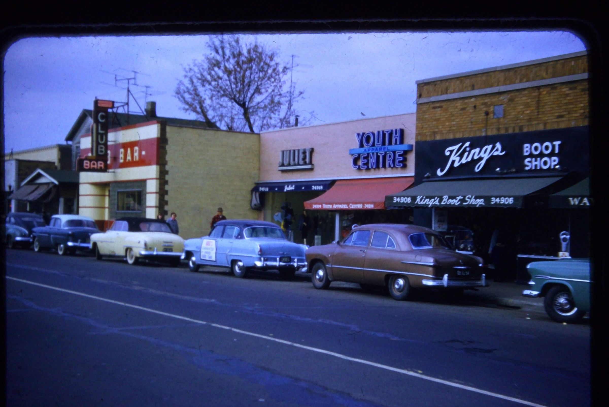34932-34906 Michigan. Derby House, Club Bar, Juliet, Youth Centre, Kings Boot Shop. These facades would be cut back to allow road widening. 1950s.