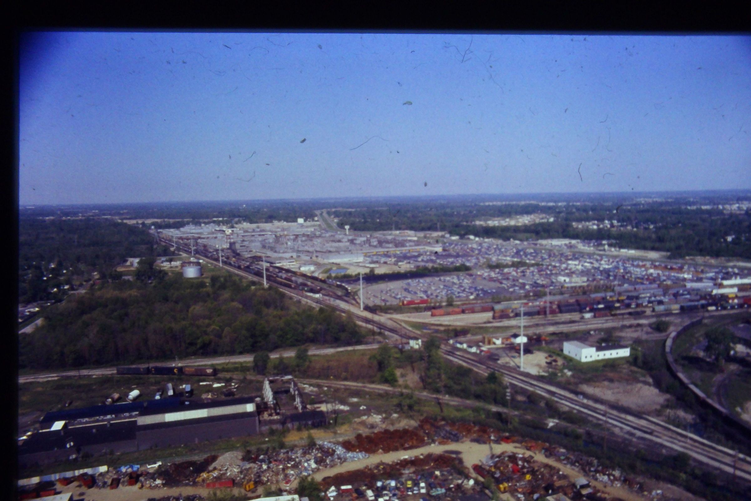 Aerial over Clinton and RR tracks, looking West. 1970s. Ford Plant
