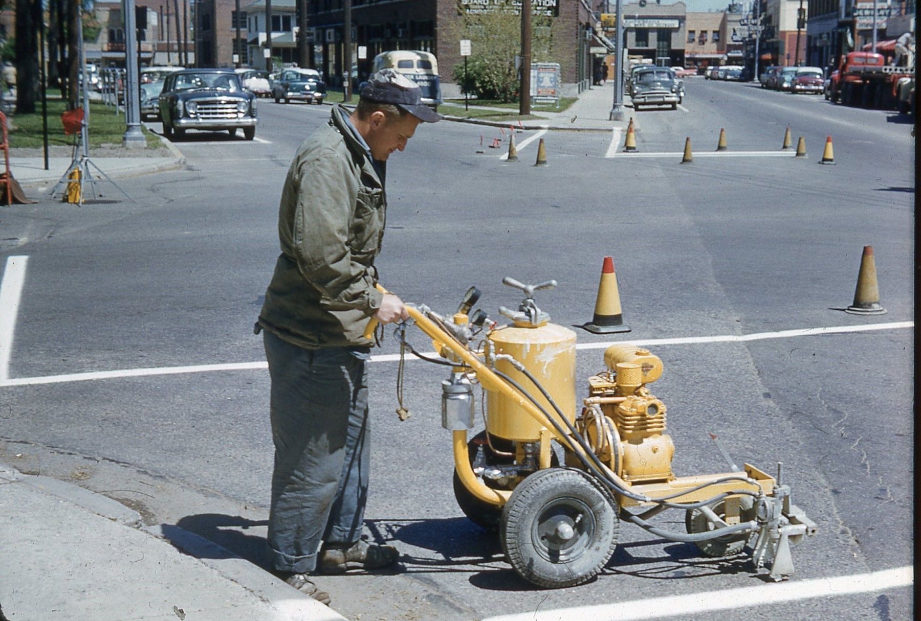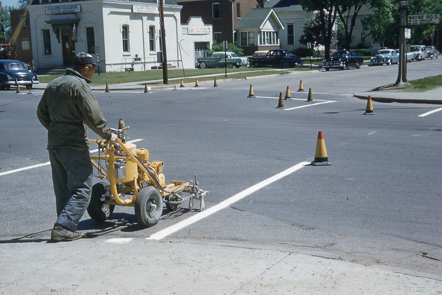DPW worker painting street lines. Late 50s. Monroe, Biuddle and Park, looking North