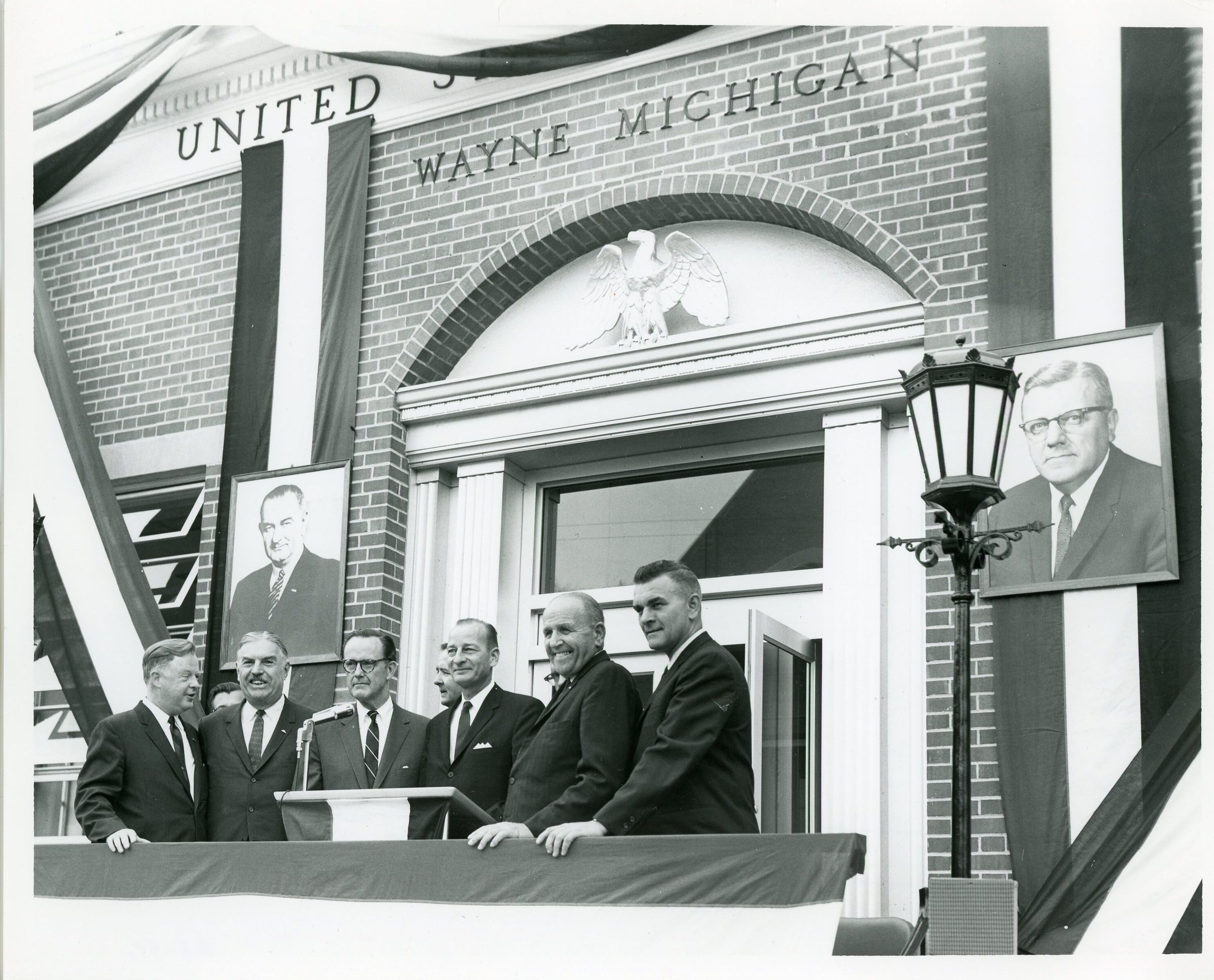 Post Office Dedication for 1964 remodeling. From left to right, Neil, Staedler, Philip Hart, John Lesinski, Dan Howell (Postmaster) and James Attwood (Wayne Mayor)Cataloged By