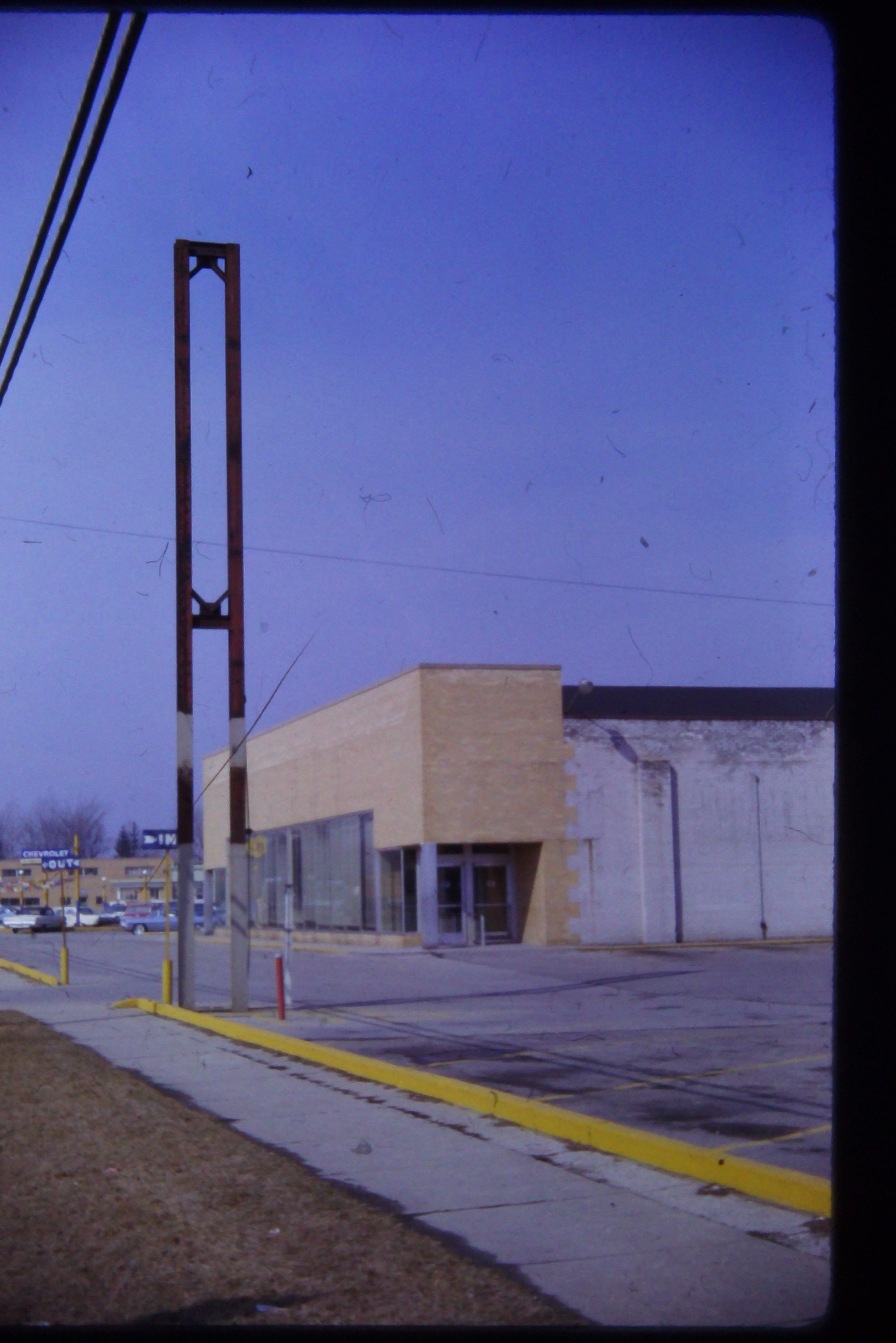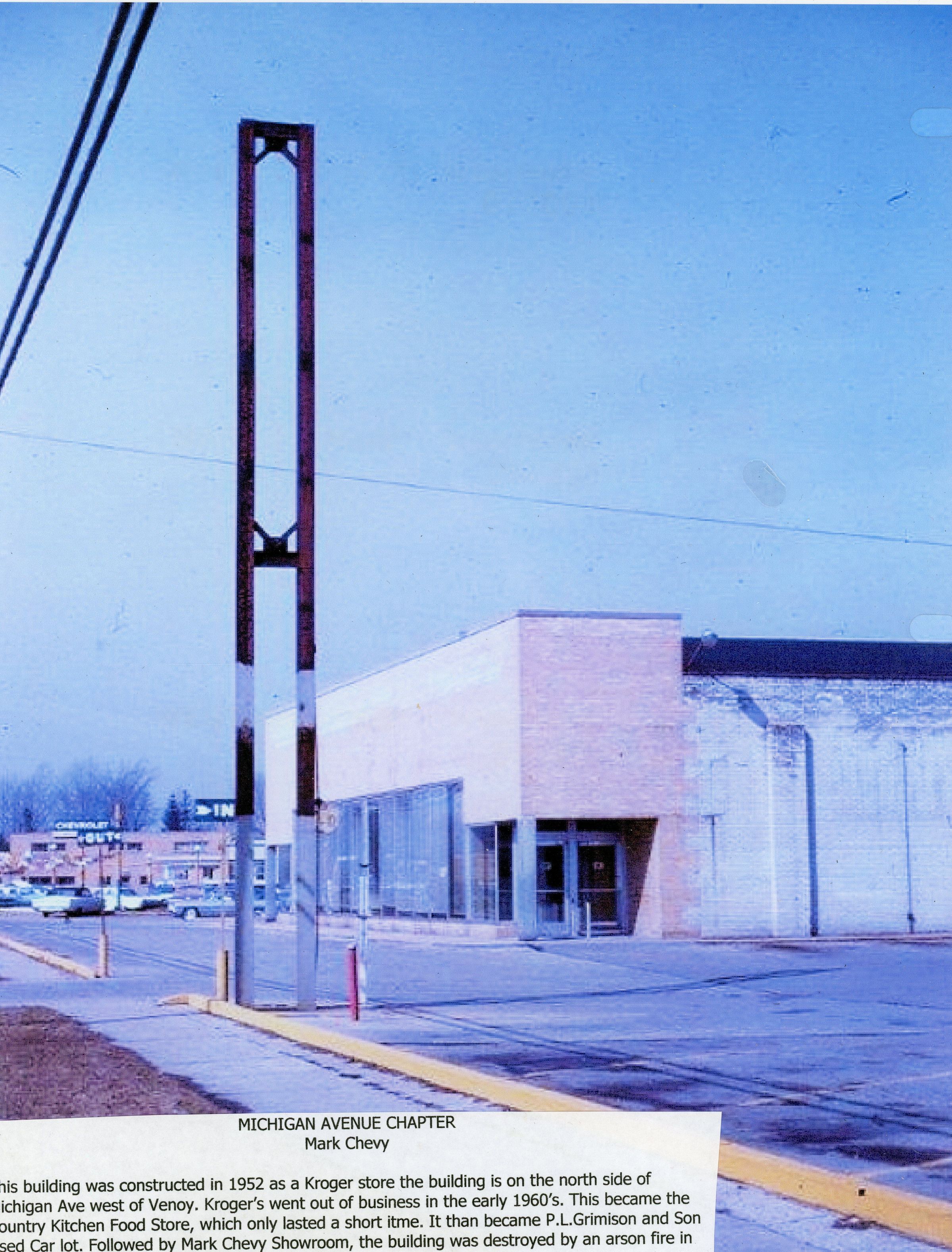 33200 Michigan - Mark Chevy Showroom. Built in 1952 as a Kroger grocery store, closed early 60s. Then became Country Kitchen Food Store, which did not last long. Then became P.L. Grimson and Son used car lot. Then became part of Mark Chevy showroom until it was destroyed by an arson fire in 1987. Today it is a parking lot for Mark Chevrolet.Cataloged By