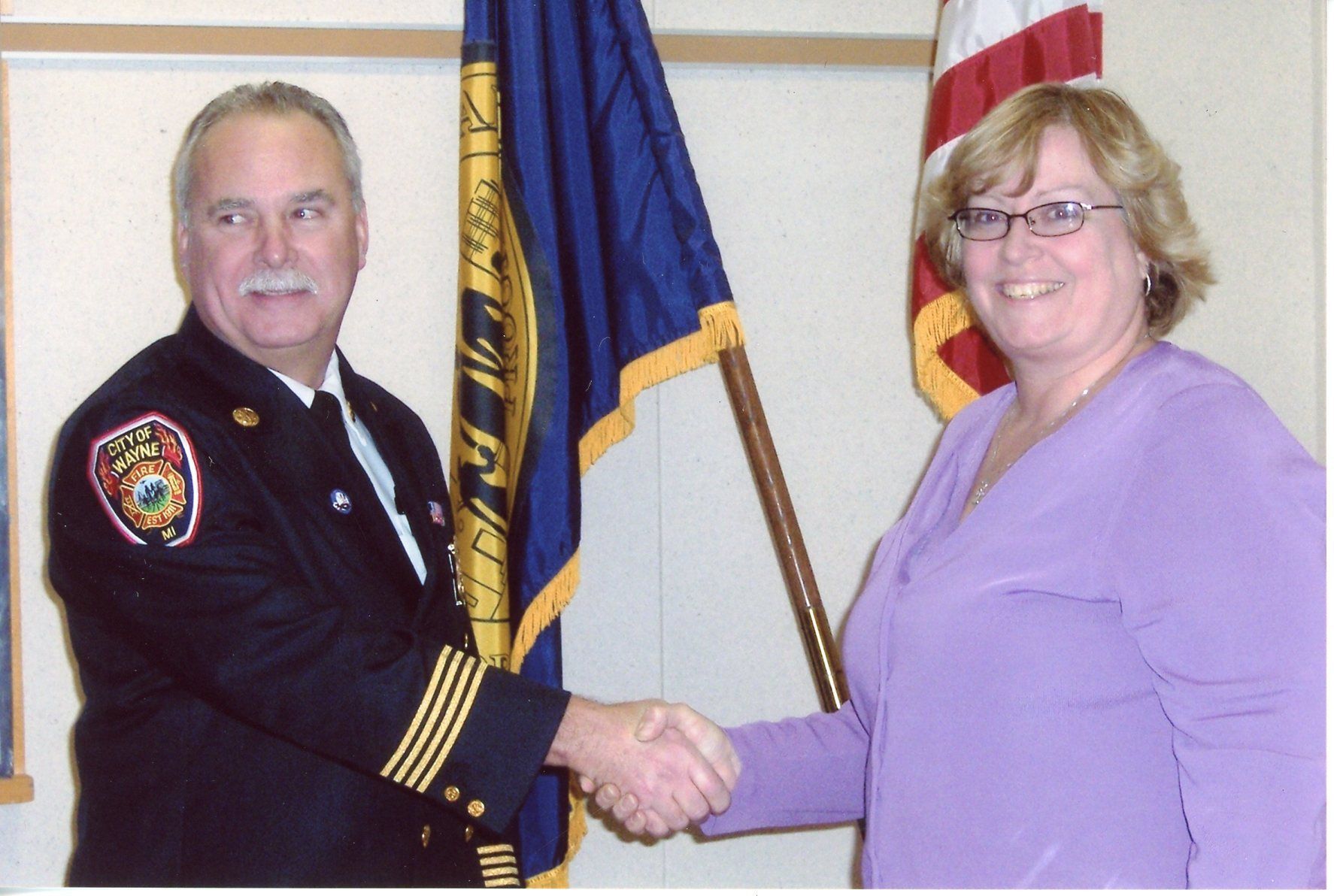 Deputy Chief Mike Mcgee shaking hands with Wayne City Clerk Mary Carney