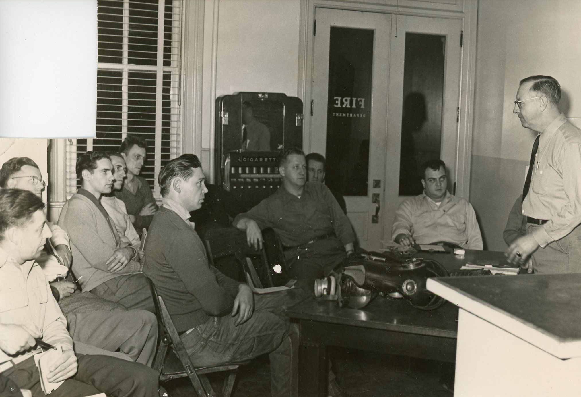 Interior of Village Hall Fire Station. Wallace Gannon speaking- U of M Extension