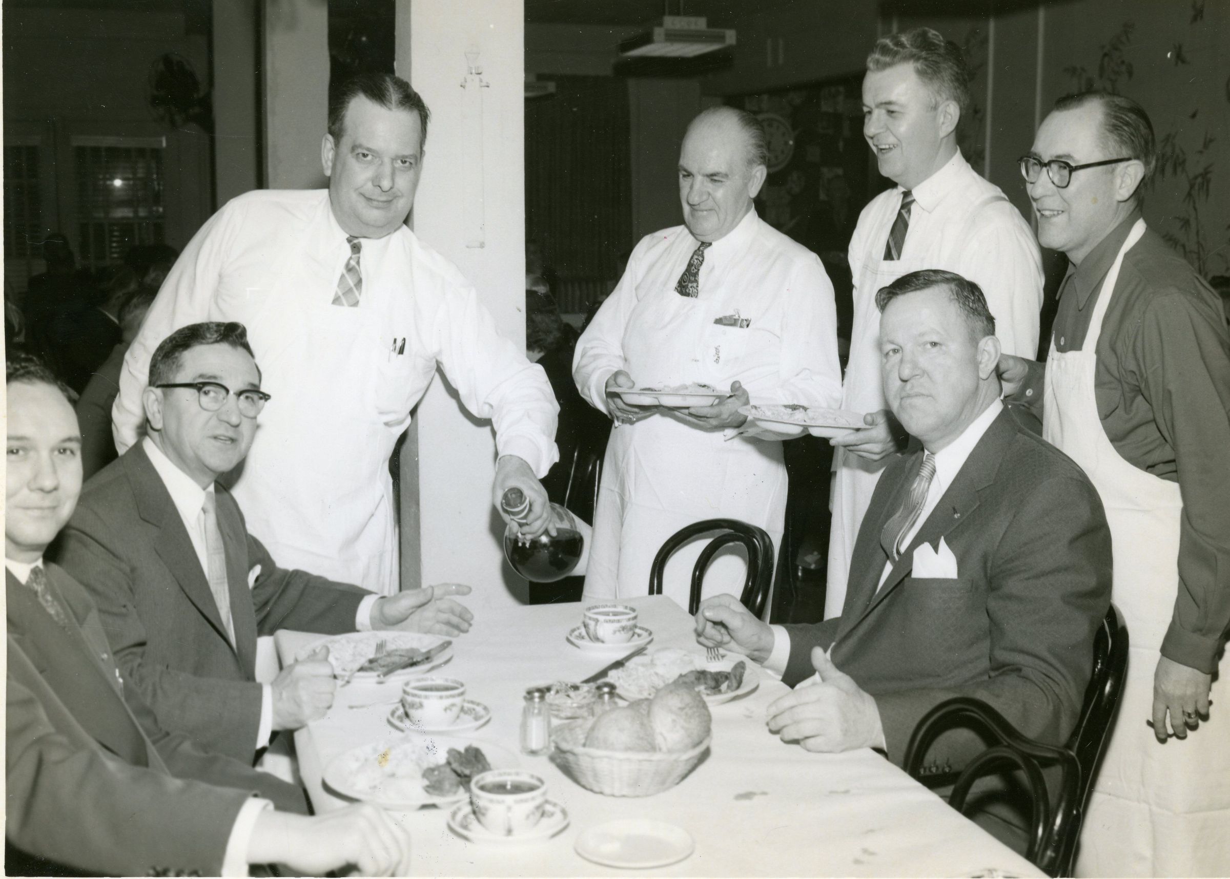 K. Millar, Mr. Dowling, Whitney Ballentine and Nye Hawley are at the Rotary Club Fish Fry. They may be the Servers. Photo for the "Eagle".