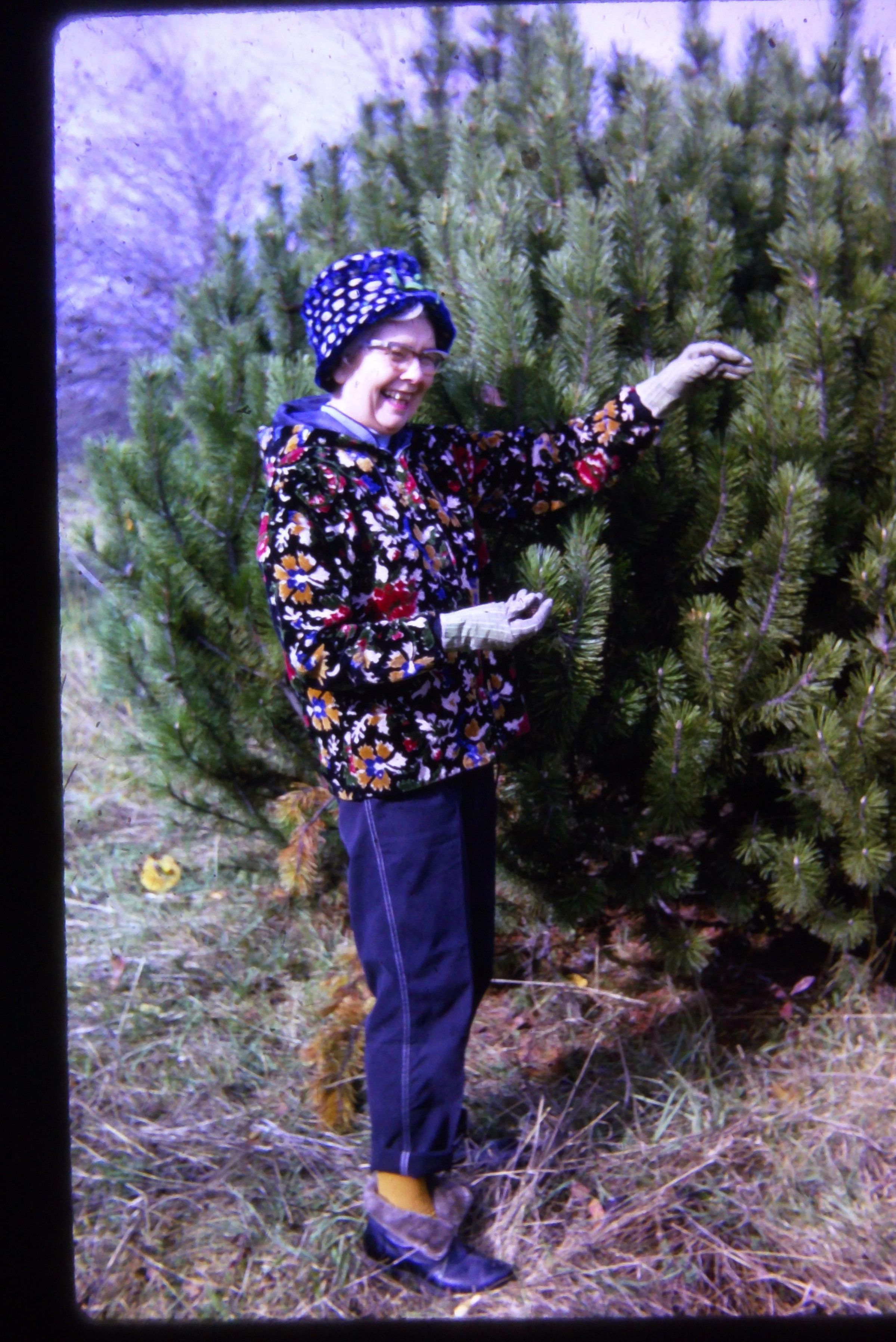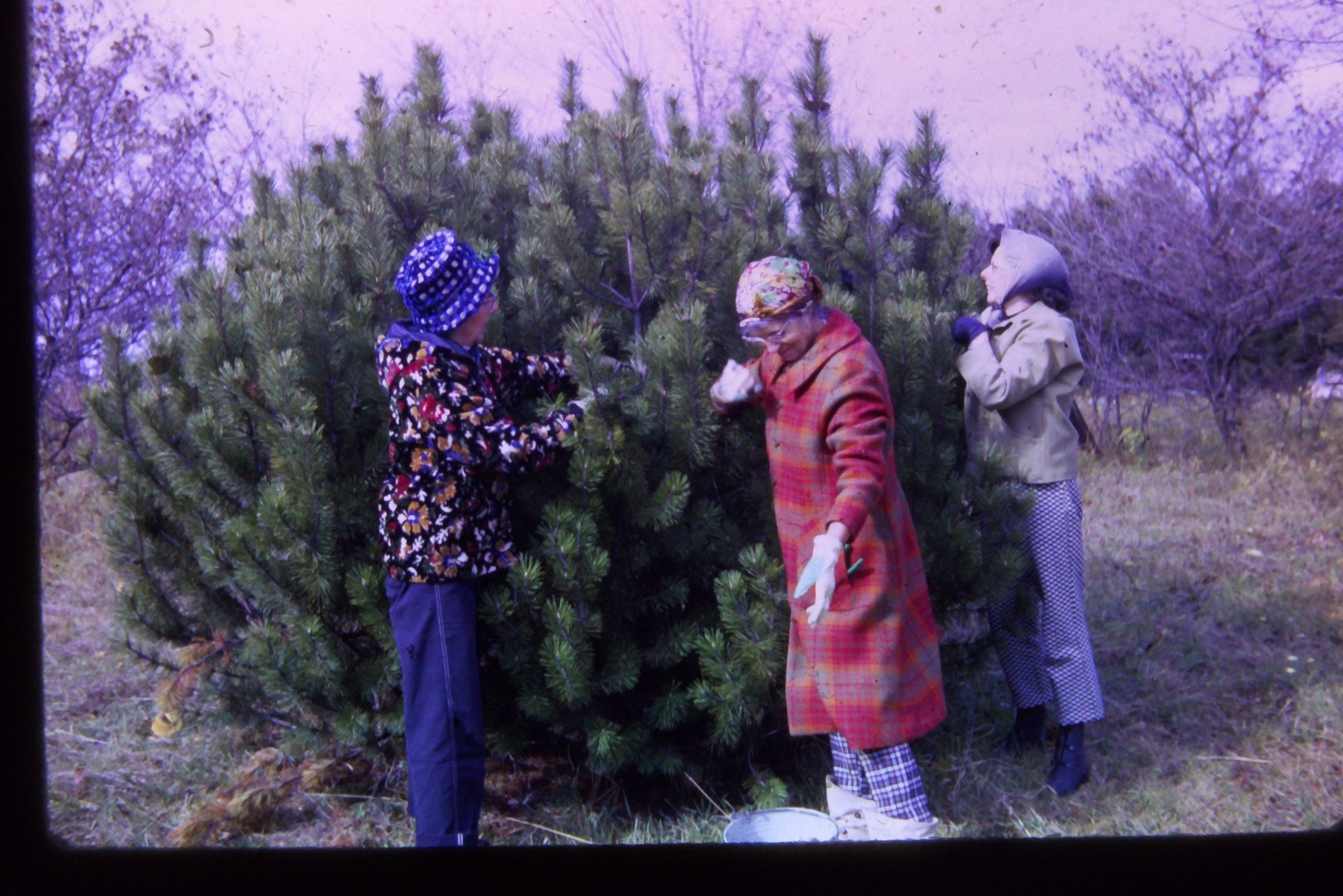 Garden Club members collecting pine cones and greens at Hanchett Tree Farm in preparation for the 1968 Greens Market. The Hanchett Tree Farm was located in Plymouth Twp on Ridge Rd. This photo was taken by Don Hanchett in October of 1968.Cataloged By