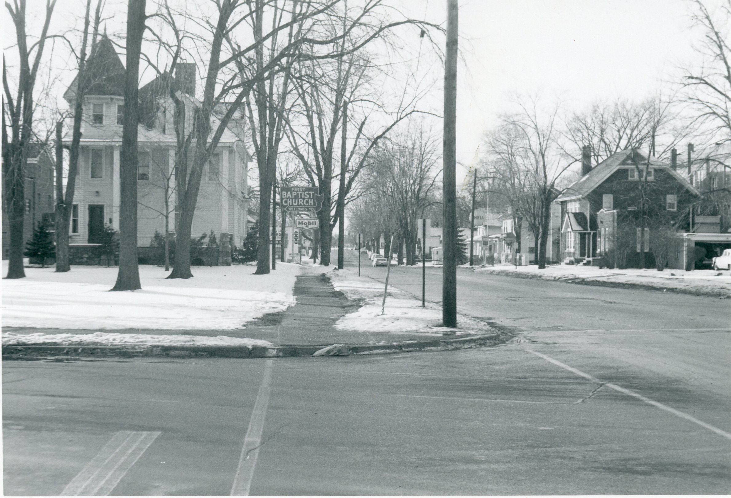 Intersection of Main, Biddle and Monroe, looking West down Main. Stellwagen House on left also former Ted Harper house, Methodist Church Parsonage on right.Cataloged By