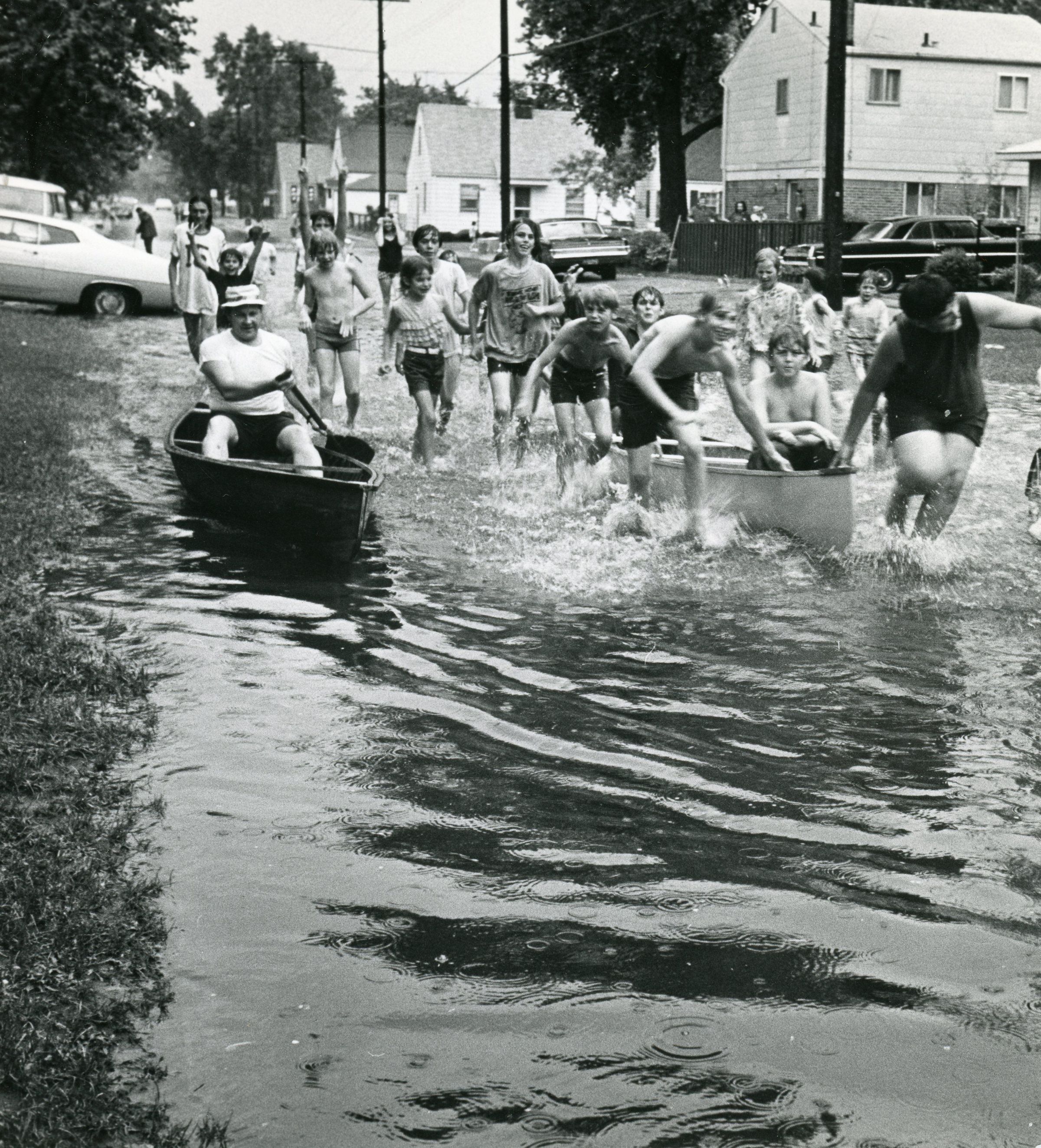 Winslow Street flood June 21, 1972. Eagle Photo. Mr. Bill Kline in boat