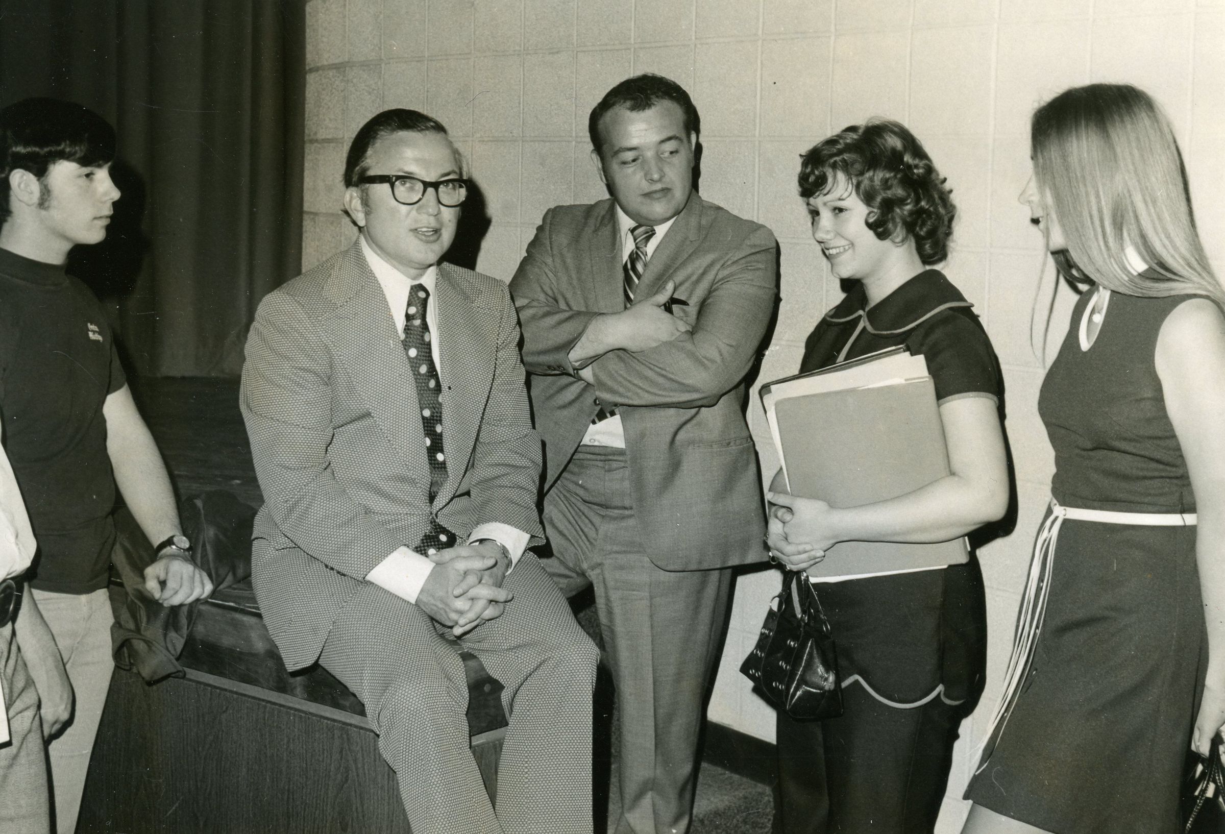 Wayne Memorial High School, Bill Ford visits WMHS. Girl on left is Bobbie Elsmnigen