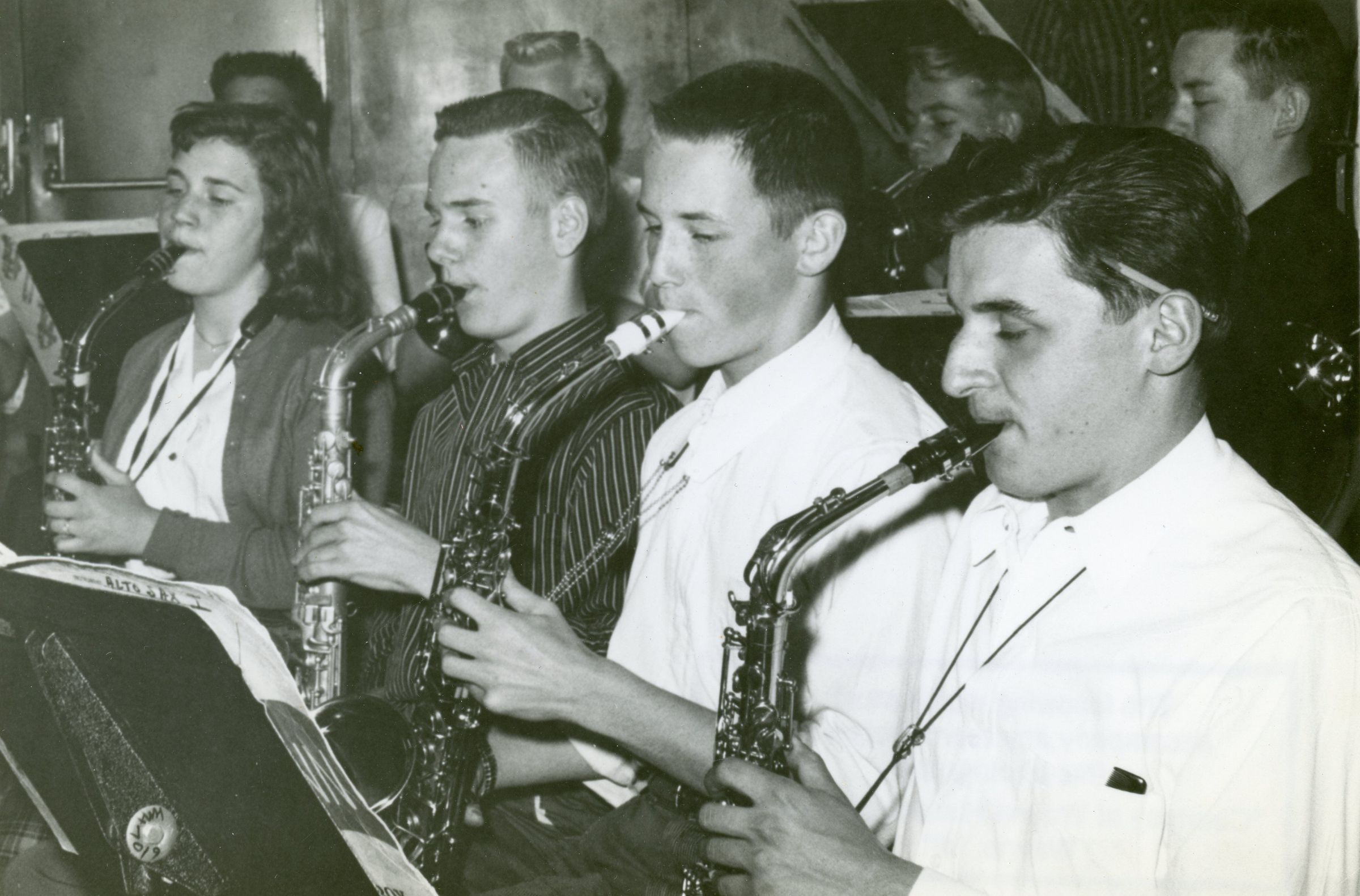 Wayne High School Band. Saxiphone players, unknown year. Barry Osborn 2nd from right