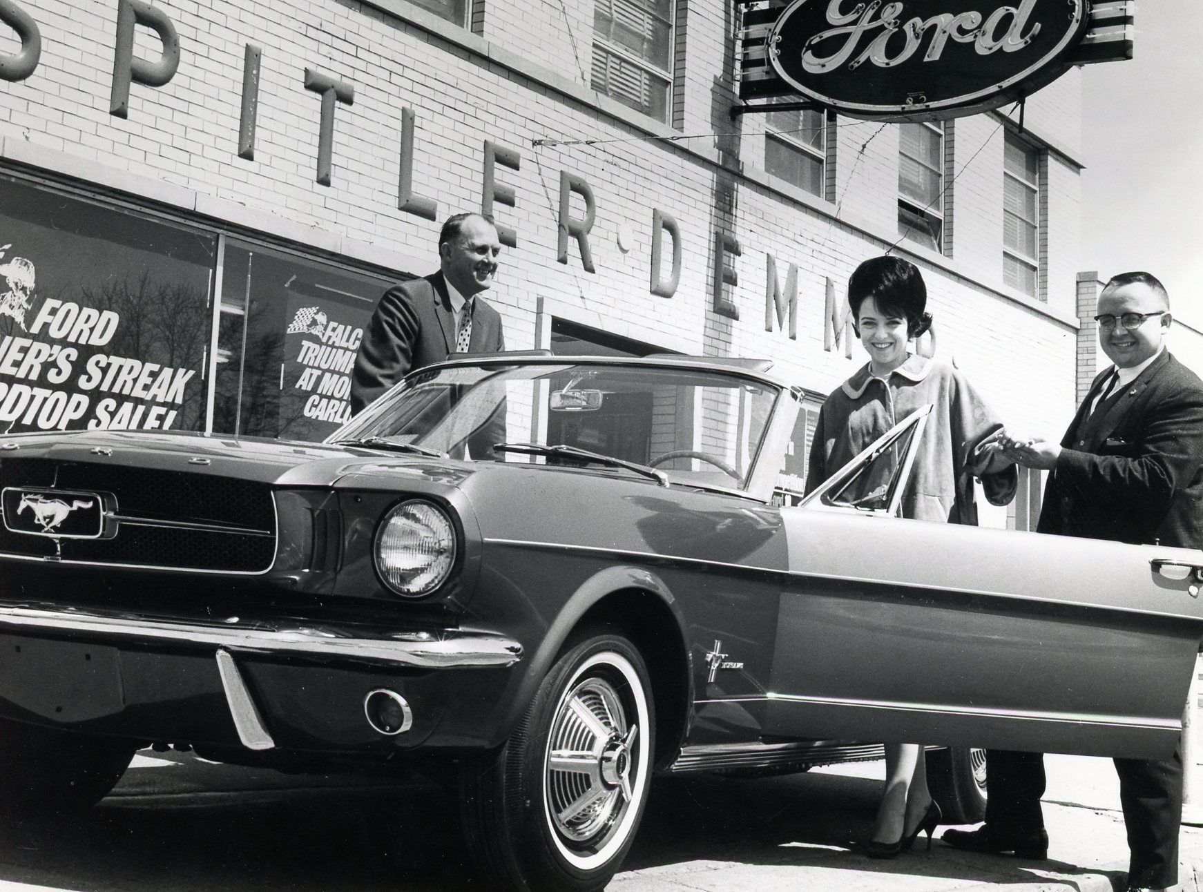 35540 Michigan, North side of between Sophia and Elizabeth. Jack Demmer on left, Barbara Wallace in middle, on right is Skip Anderson. Barbara was purchasing first Mustang at Demmer.Cataloged By