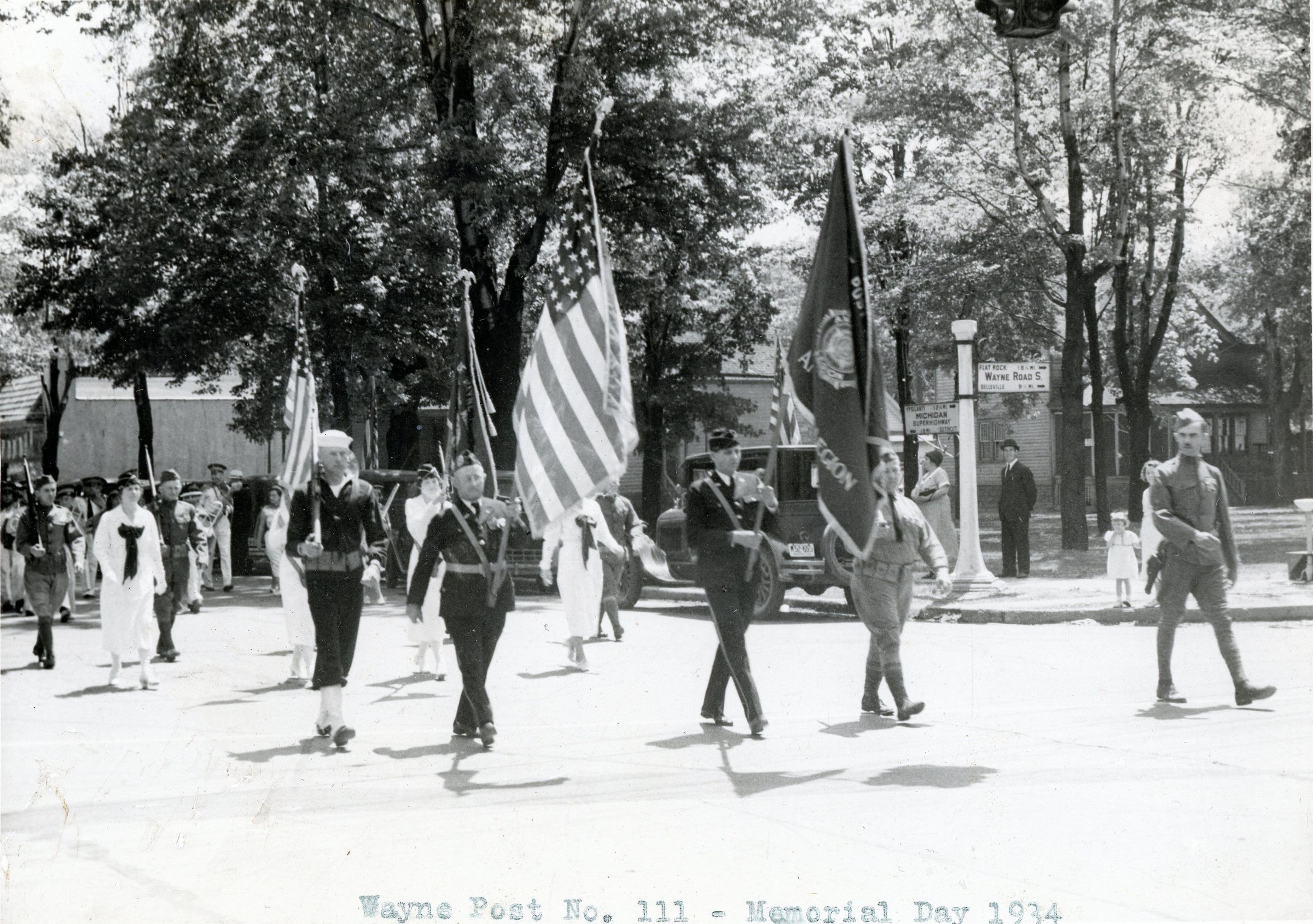 Memorial Day Parade 1934. SE corner Michigan and Wayne road. Front Rank - Thomas Sigworth, Lloyd Smith, Harry Dunbar, John Frye, Paul Herig