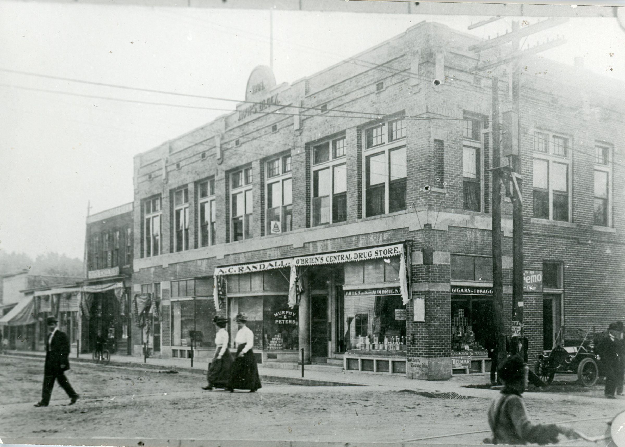 1909. O'Briens Drug Store in corner shop at right