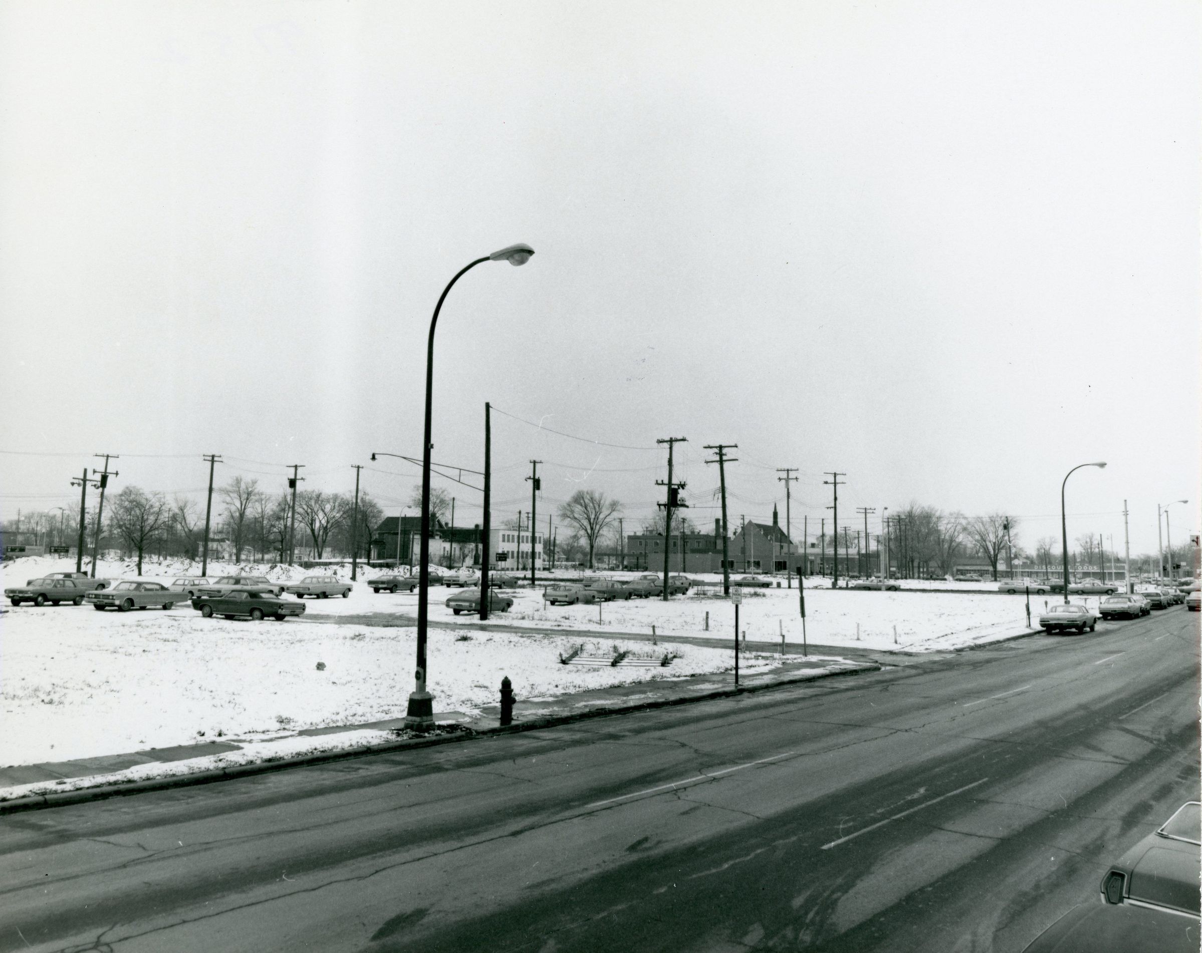 Michigan At 2nd street looking SW. 1972. Congregational Church and Methodist Church visible. Feb. 1972, just after Urban Renewal.Cataloged By