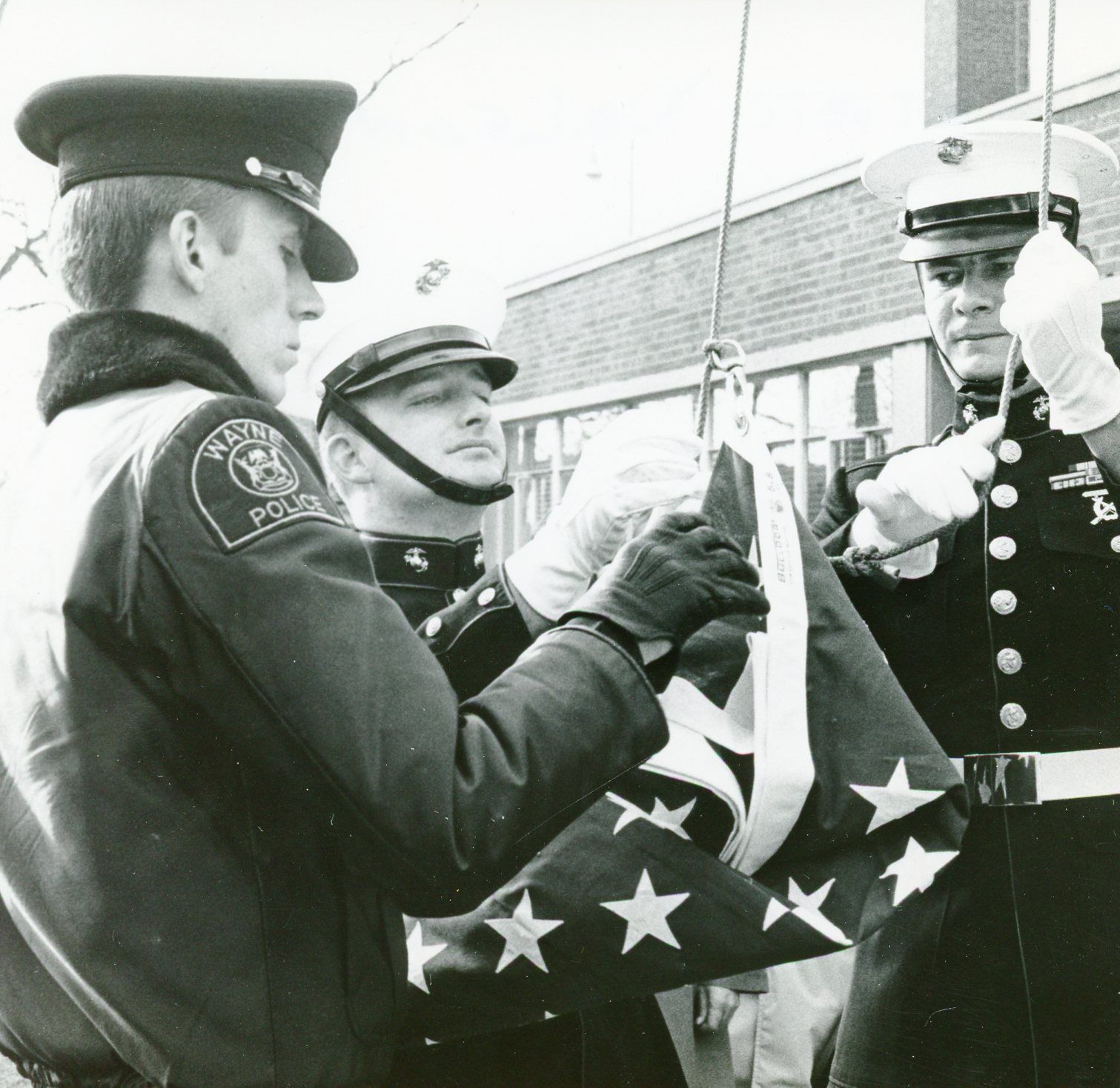 Wayne Police Department's Flag Presentation on either Apr 5 or Apr 7, 1971. Peter Nelson is in the photo. Lothar. E. Konietzko took the photo.Cataloged By