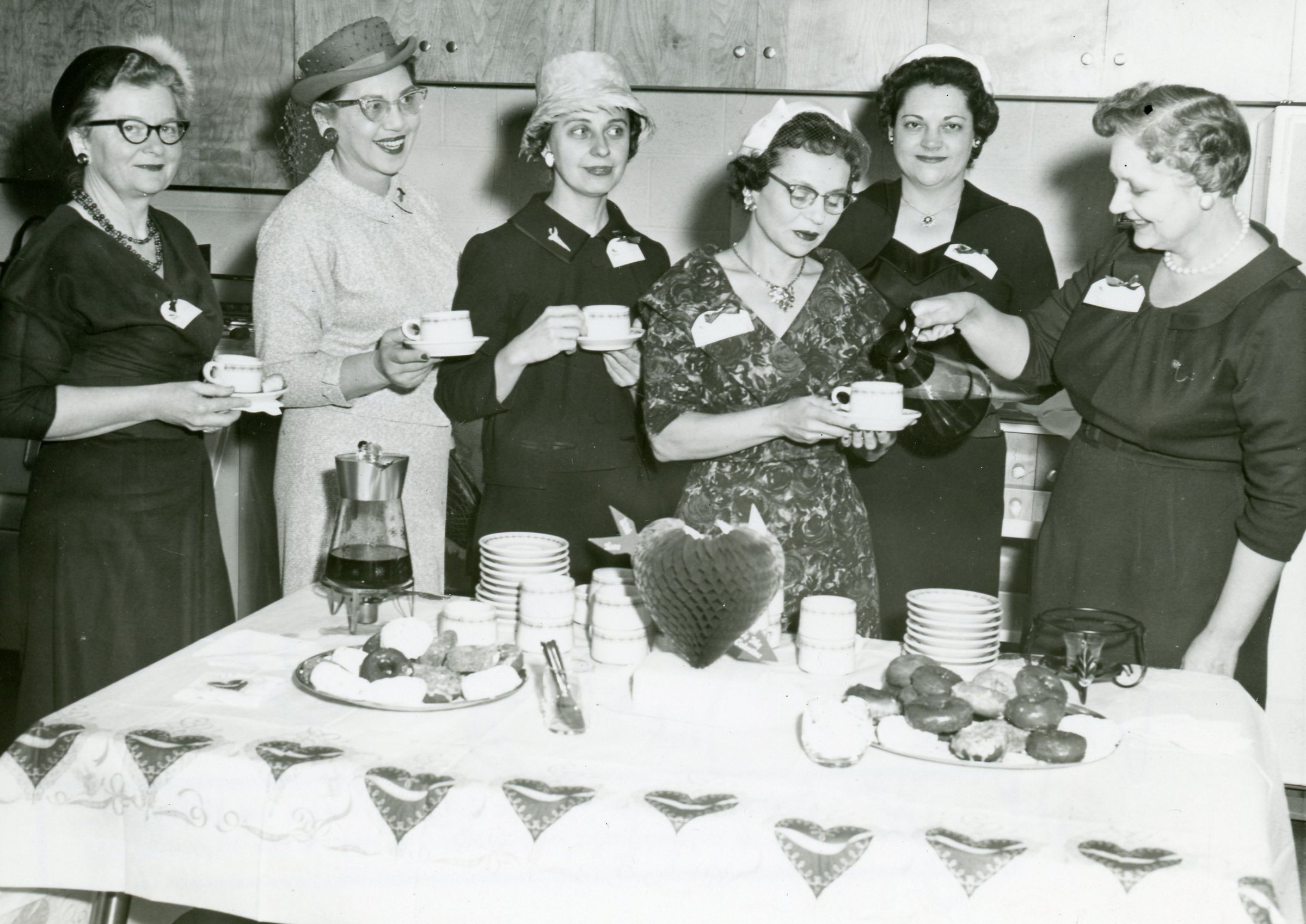 2/3/1960 Chamber Coffee Hour where BPW hosted. From Left to Right: Mrs. Bernadine Biebesheimer - Secretary, Mrs. Cristopher Blutz Reverding - Secretary, Mrs. Julie McMach - Vice President, Mrs. Betty Lou Frey - President, Mrs. Yulom Smith - Genral Chair, Mrs. Marci VanMeter.Cataloged By