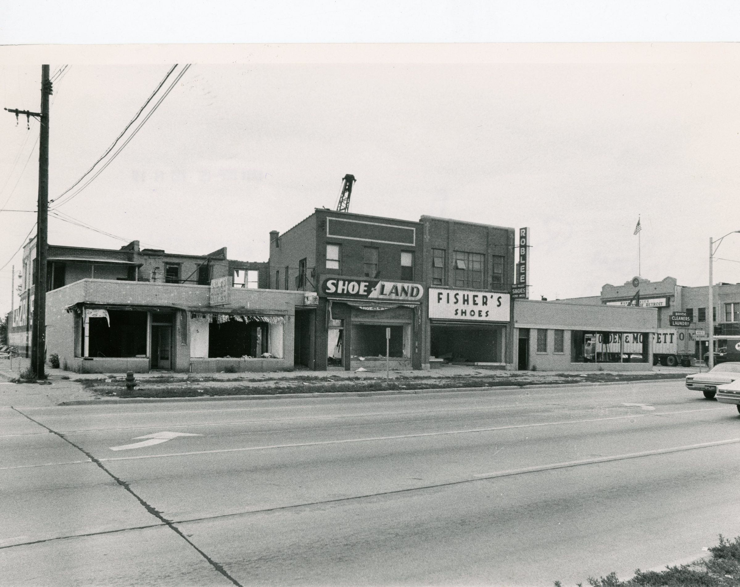 3628 - 3612 Wayne Road (Washington). Looking NW towards Michigan Ave. Shoe land, Fishers Shoes, Roblee Shoes, Cameo Snack Shop Visible. SW corner Michigan and Washington (Wayne Road). September 15 1971, just before demolitionf or Urban Renewal. R-54.Cataloged By