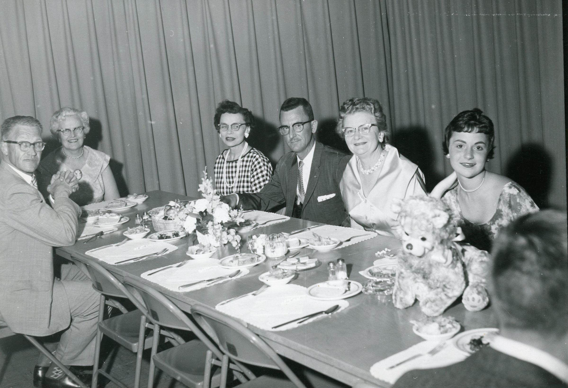 Wayne Memorial High School Senior Banquet 1959 from L to R: Earl Greene, Mrs. Agnes Greene, Mrs. La Frey, Mr. Raymond La Frey, Mrs. Bernadine Biebesheimer and Lois La Frey.Cataloged By