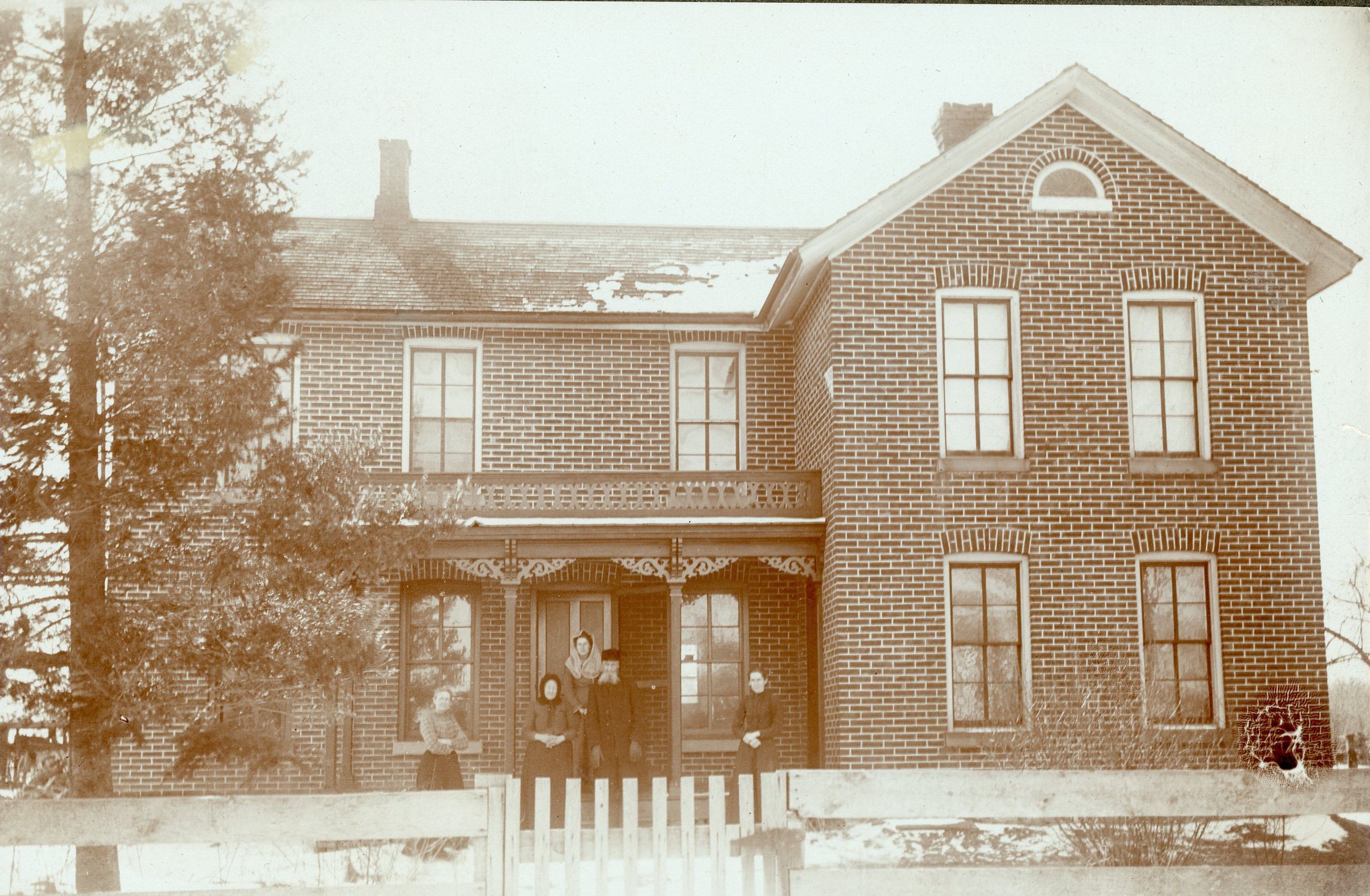 Rev. David Parker Home on Tyler Street. SW corner Tyler road and Haggerty, Van Buren Township. Home built in 1870 of brick from Warren brickyard. Rev and Mrs. Parker, Bertha, Adelaide, and Florence Bateham pictured.Cataloged By