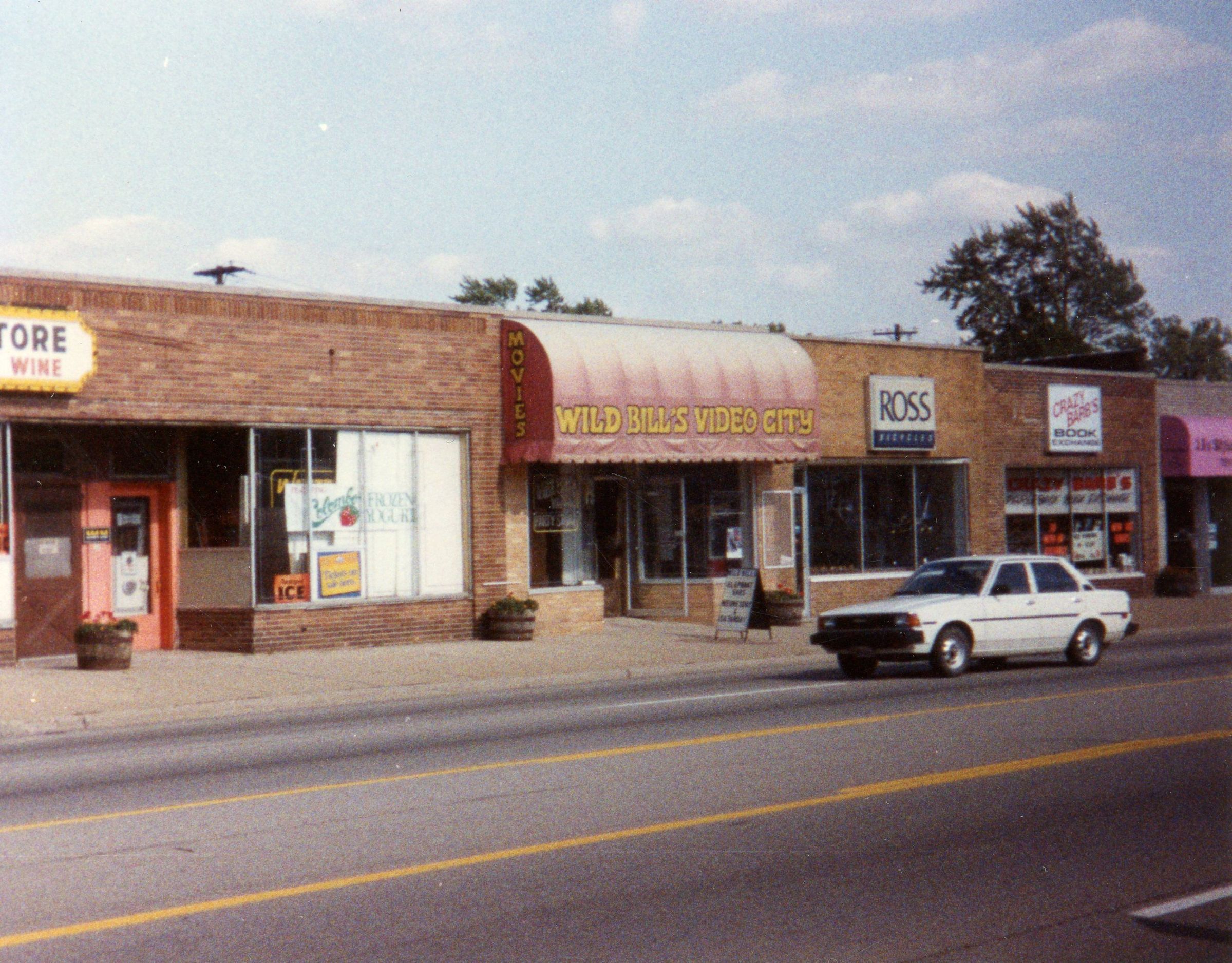3119 S. Wayne Road. East side between Elm and Ash. Wild Bill's Video City, Ross, Crazy Barbs Book Exchange. Late 1980s