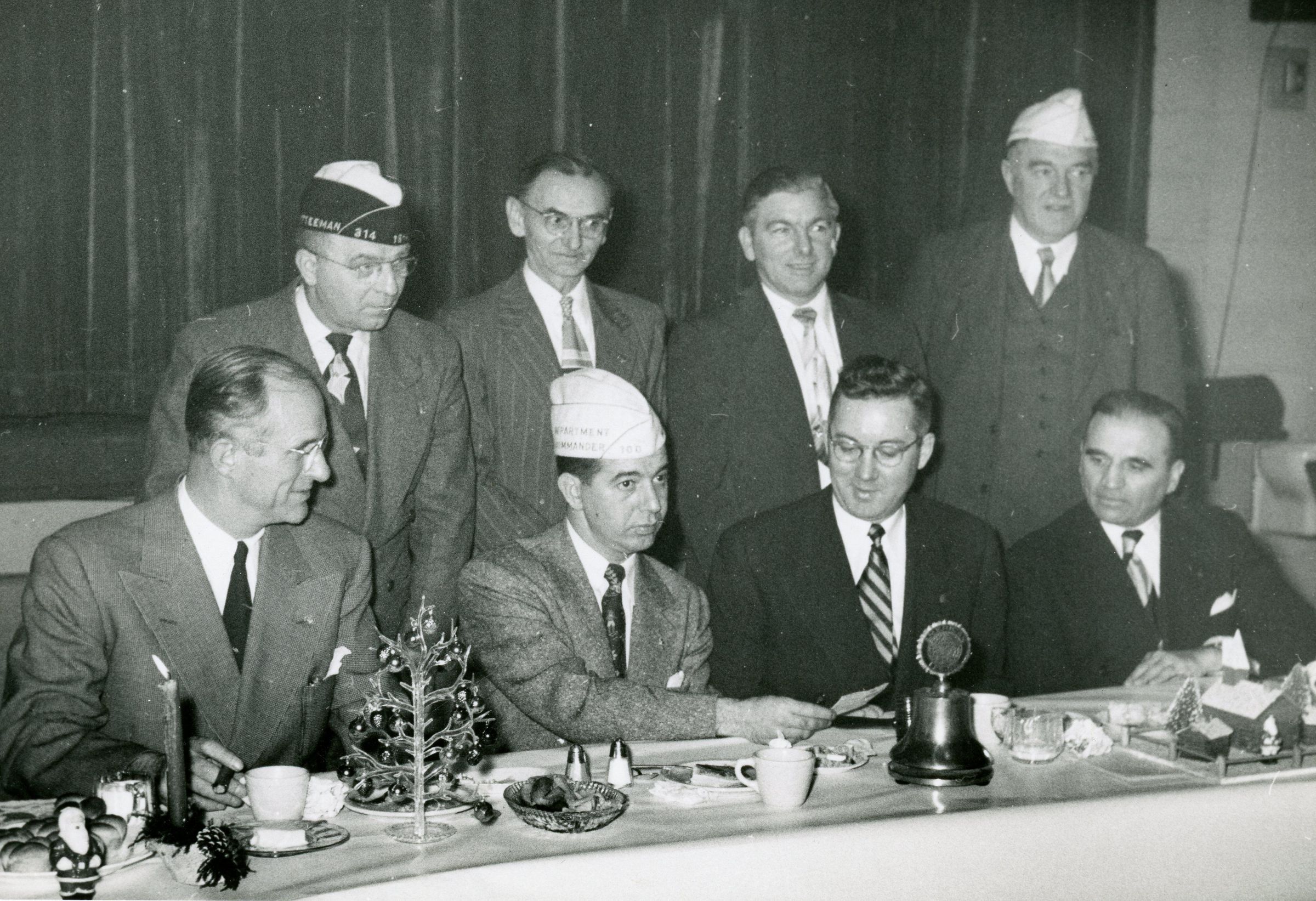 Standing: unknown, unknown, Wodworth Gamble, unknown. Seated: Edwin Smith (Kiwanis Press), unknown, Mark Cavanaugh, Dirk van Reyendam (Rotary Press)