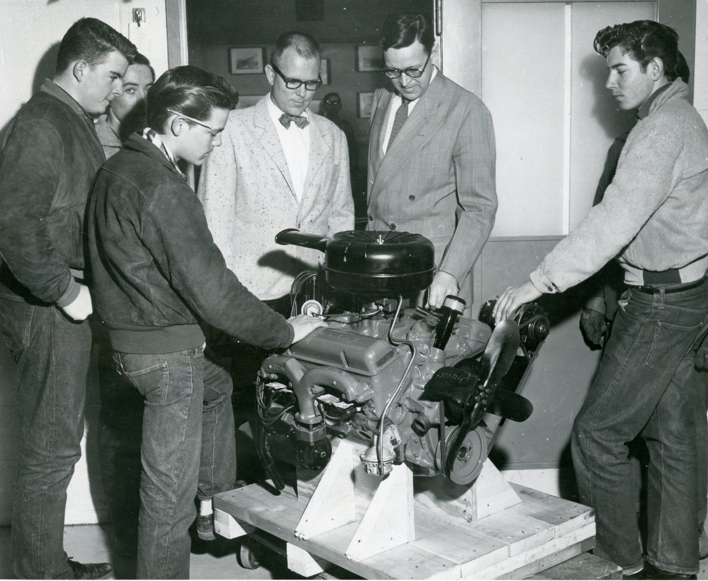 Adams Jr. High. Palmer Road. New engine for class. Joe Robinson, Al Chaffee, both 9th grade science teachers.