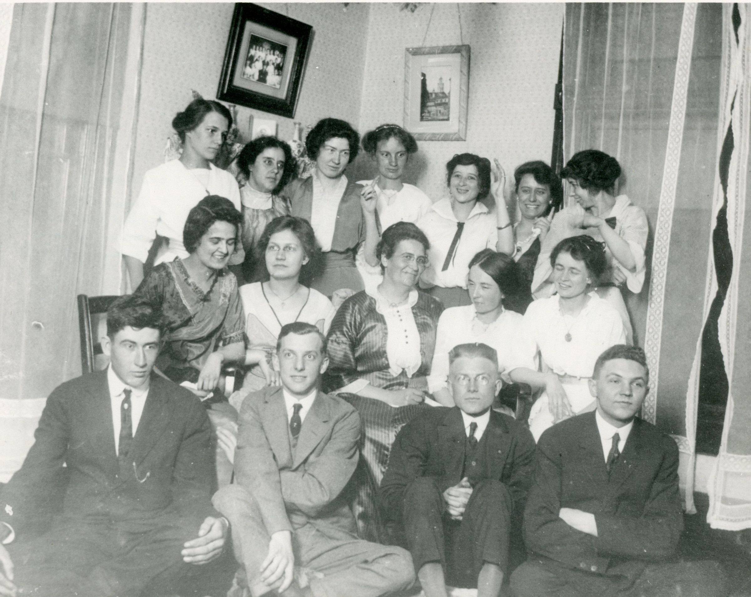 WHS 1911 Class Reunion prior to 1917. 5 year reunion? Back Row: Nellie Wendt, Belle Wilson, Mary Moore, Lattie Templin, Belle Harrison, Irene Dendel and Vera Wellman. Center Row from: Hazel Cozadd, Olive Mudge, Elizabeth Stellwagen ( School Principal), Eva McBride and Janet Harris. Front Row: Cyrus Lathers, Fred Gerbstadt, Harry Hearn and Harry Wightman.Cataloged By
