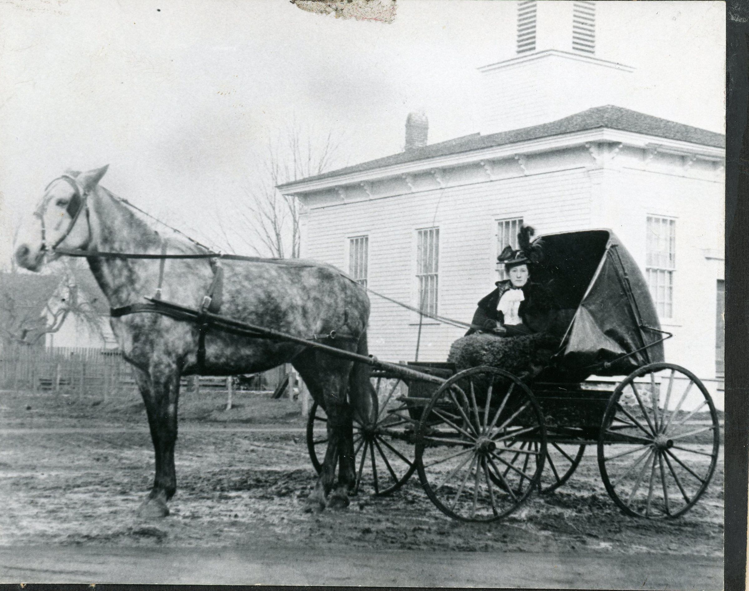 St. Johns Episcopal Church. 3831 Newberry Street. Mae Foss Snyder in front of Episcopal Church, Horse and carriageCataloged By