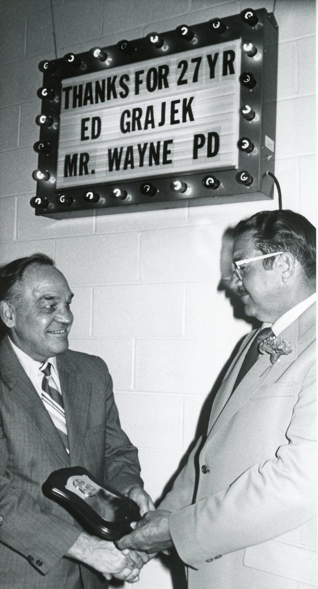 Wayne Chief McGregor giving Wayne Police Officer Ed Grajek a plaque. Photo taken by Lothar E. Konietzko.Cataloged By