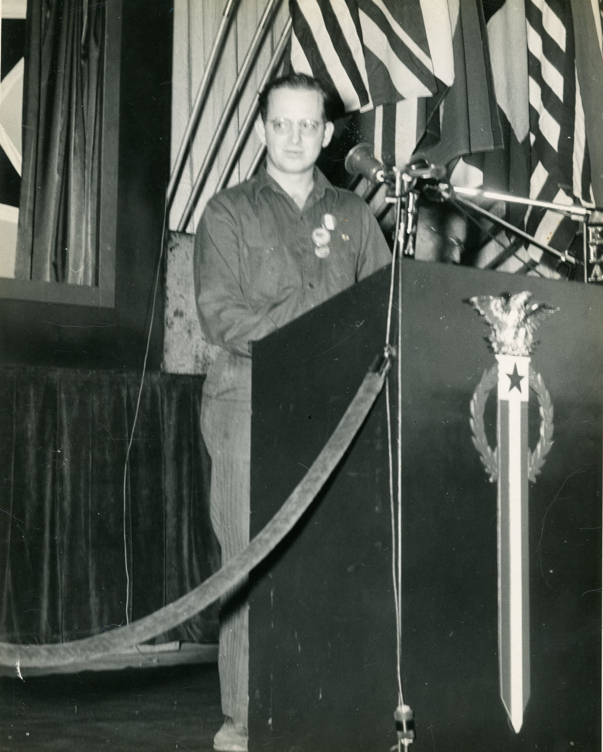 Harlan Ruark at an award ceremony at the Stinson Factory. The Stinson Factory was at the Detroit-Wayne Industrial Airport that ran along Van Born, Ecorse and Cogswell Roads.Cataloged By