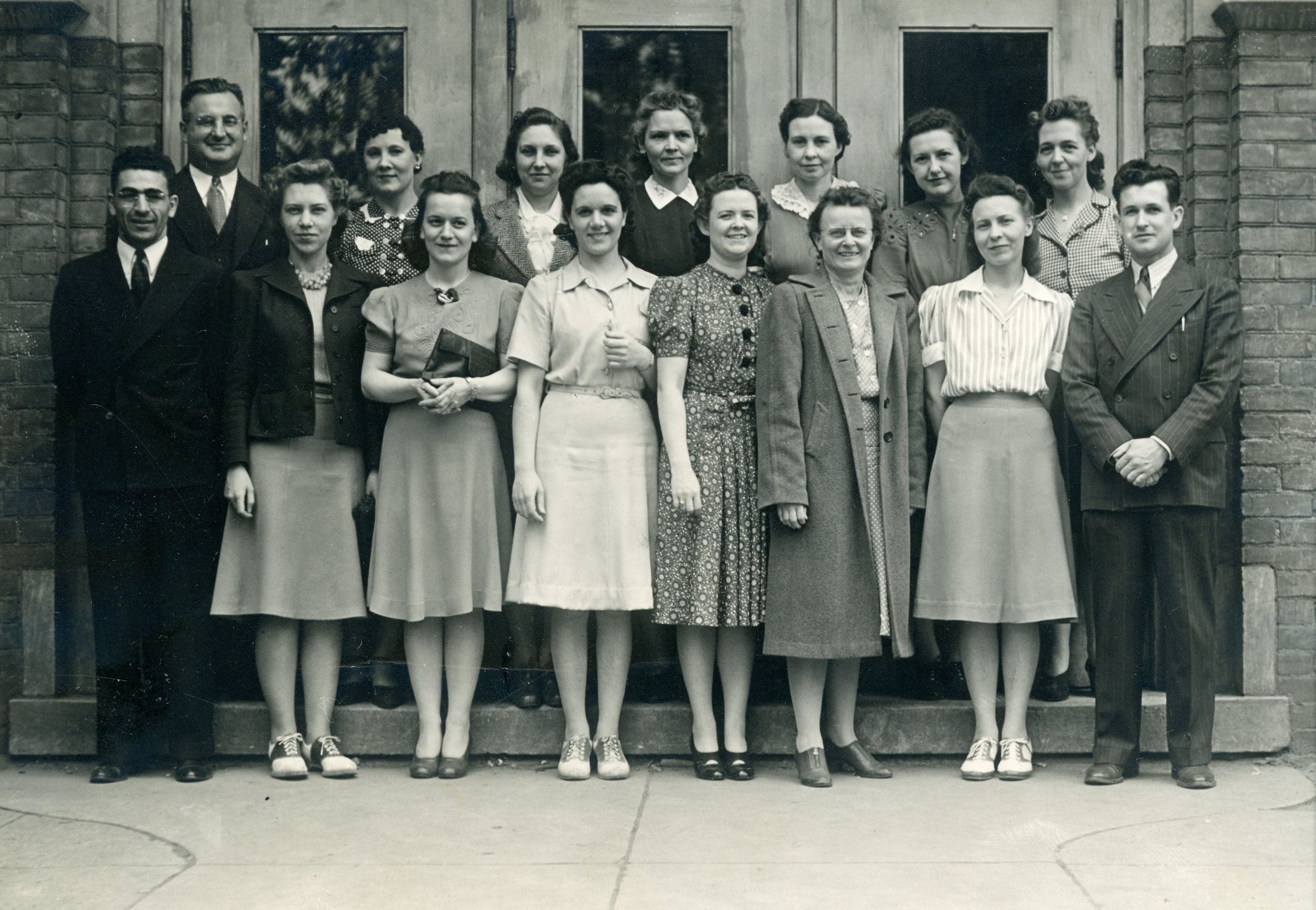Wayne High School Class of 1941. Back Row: Principal Vanzo, Vi Cox, Donna Bolt, Hazel Stewart, Mabel Newton, Genevieve Krisler Goudy, Edna Webster Murphy. Front Row: H. Vartonian, Shirley Jones Hopper, Margaret Hargrave Hatring, Paula Cooney Madigan, Charlotte Paine, Janet Lorden, Pat Reeder Bower, John Snyder. May 17, 1941.Cataloged By