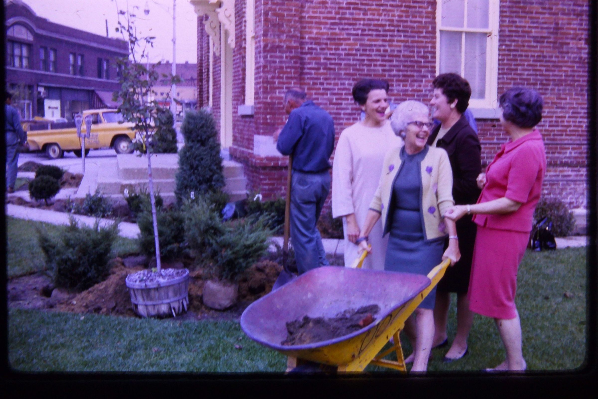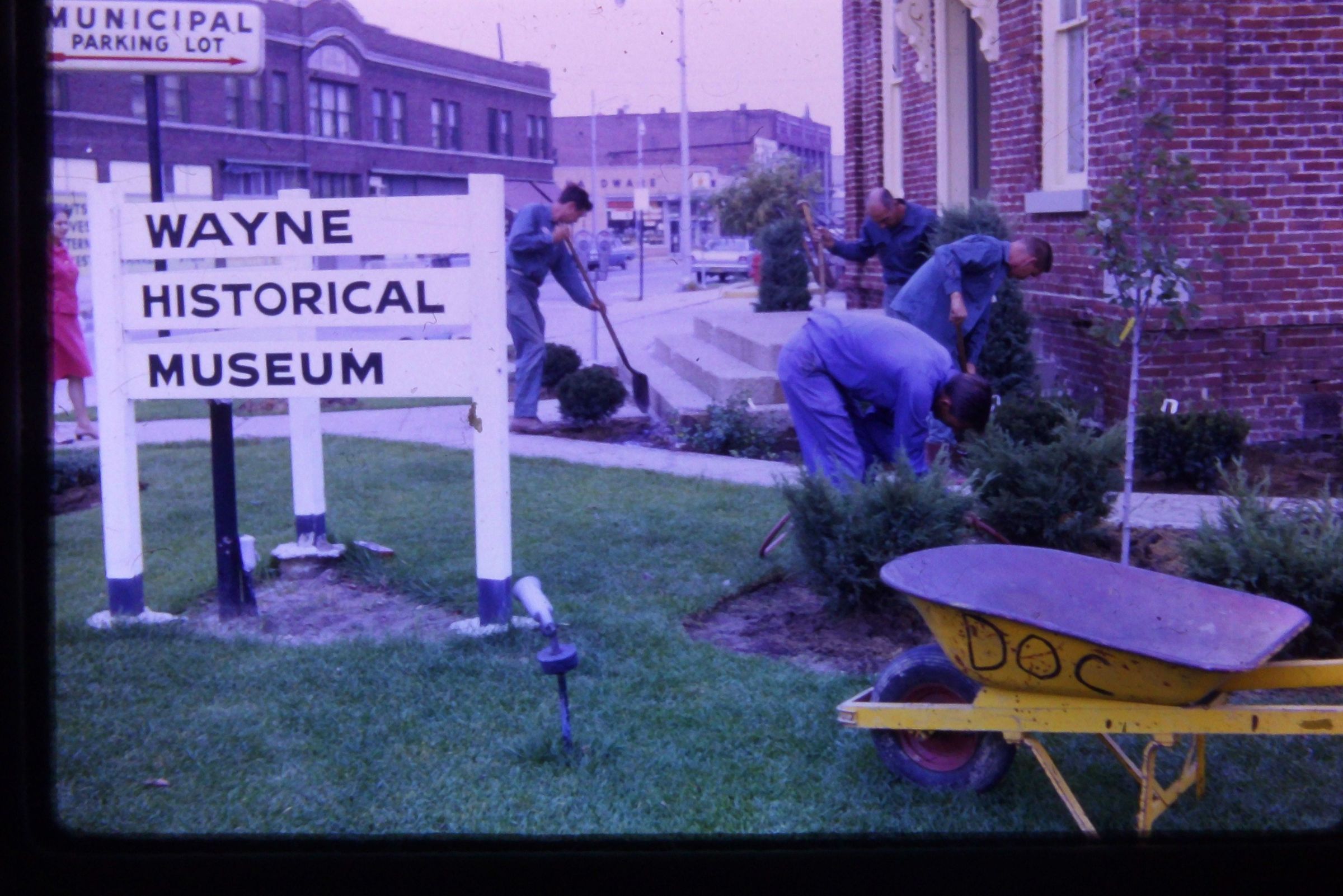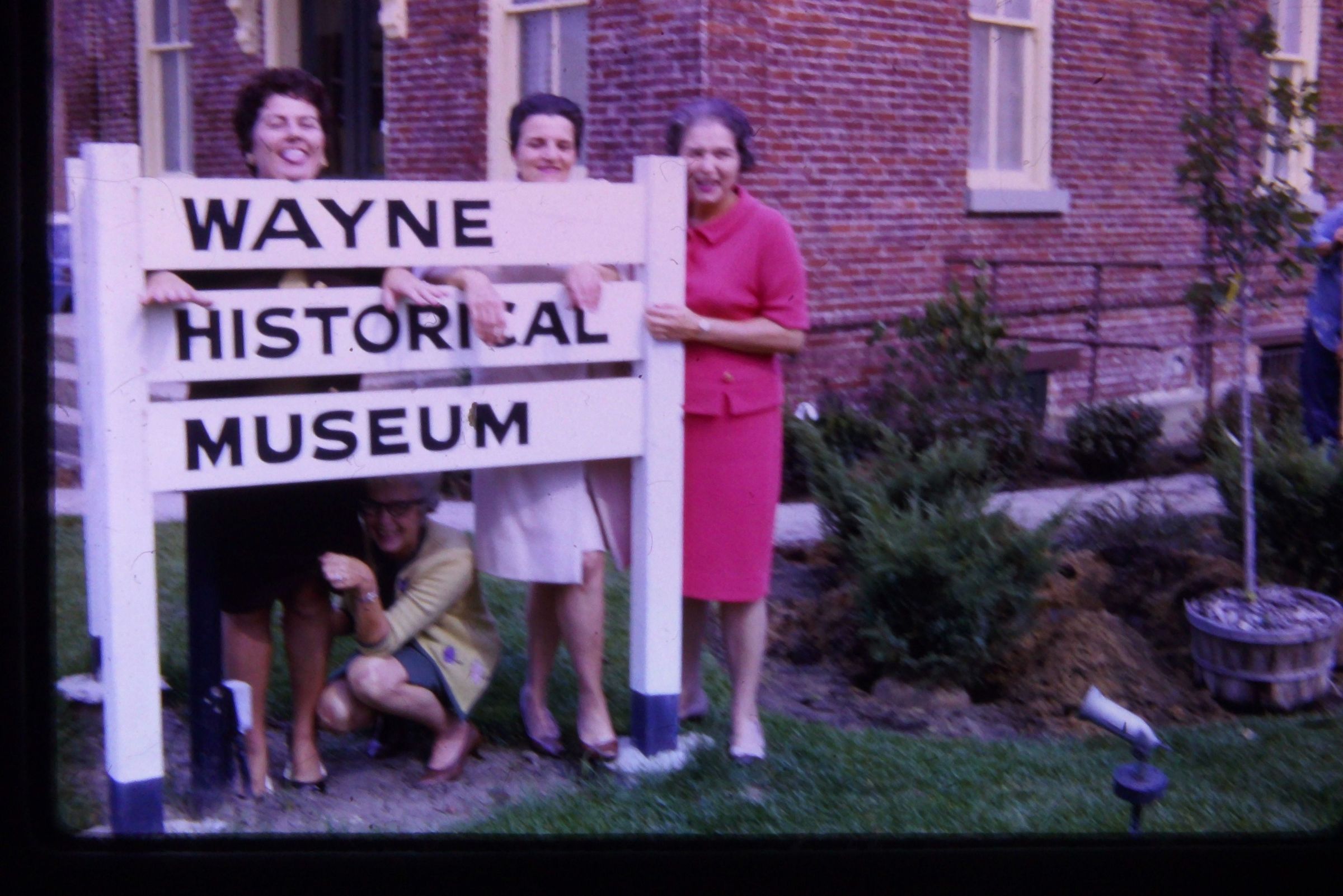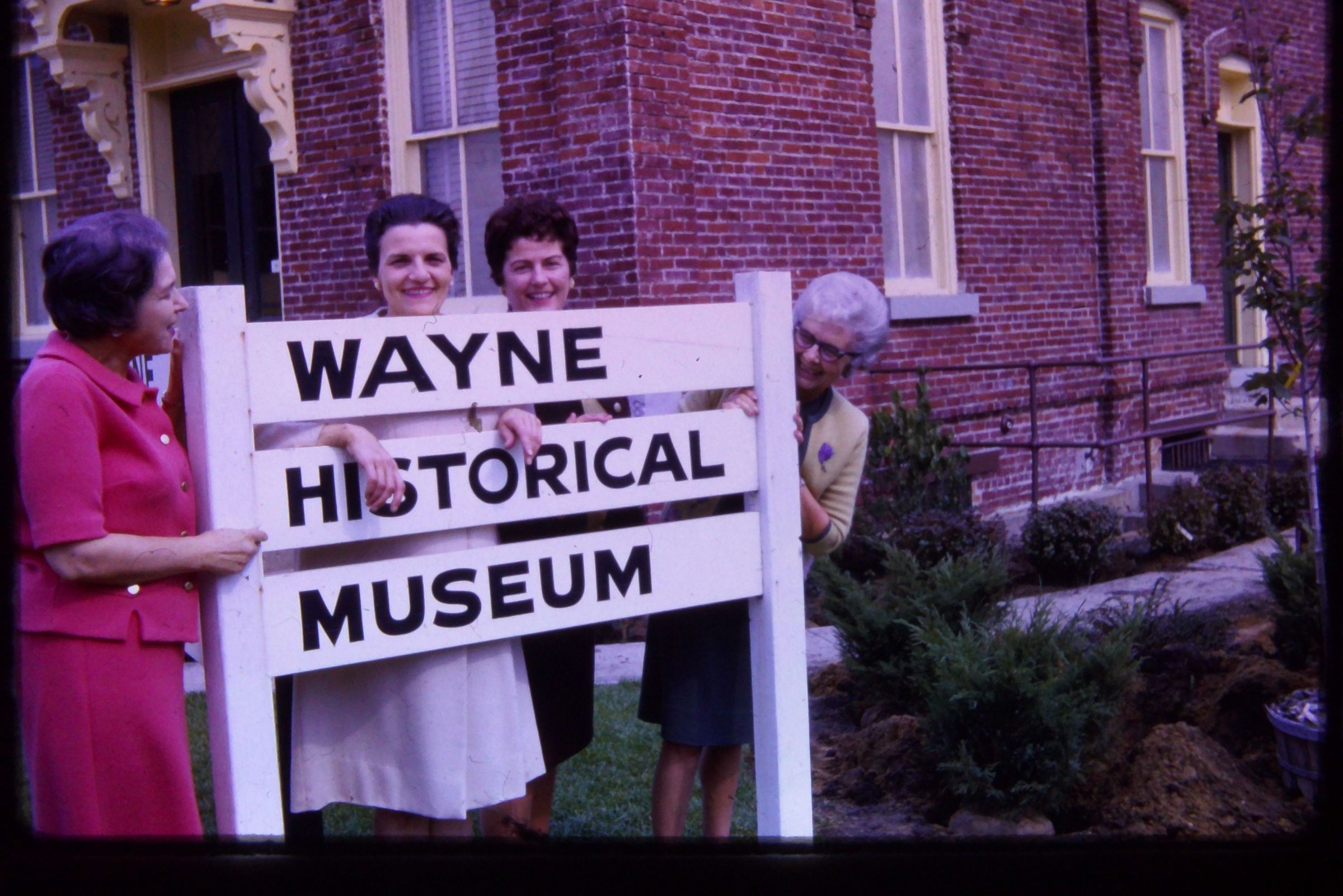 Mildred Hanchett, Marion Downes, Lorraine Ujda and Peg Bird with Wayne Historical Museum Sign in 1968.