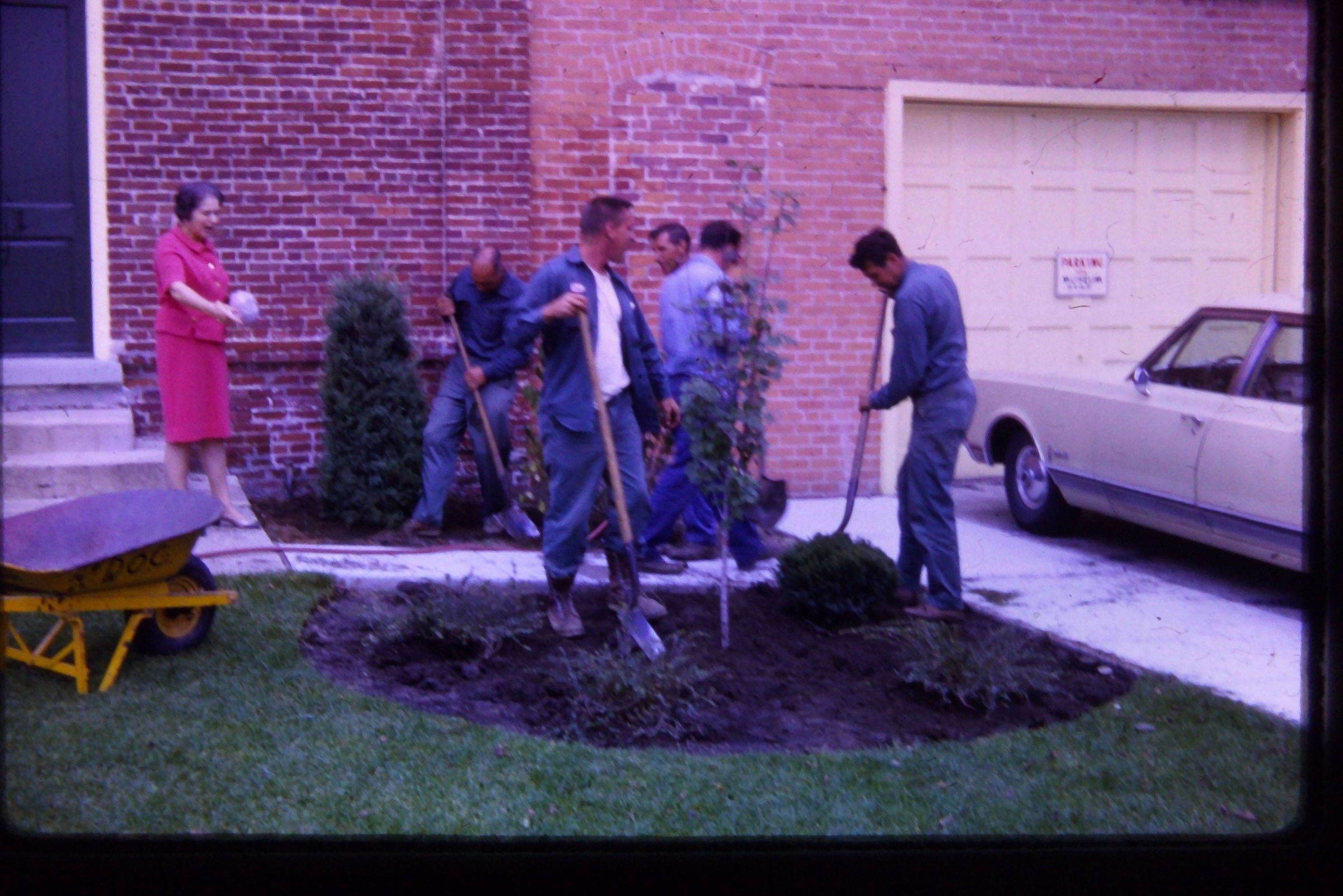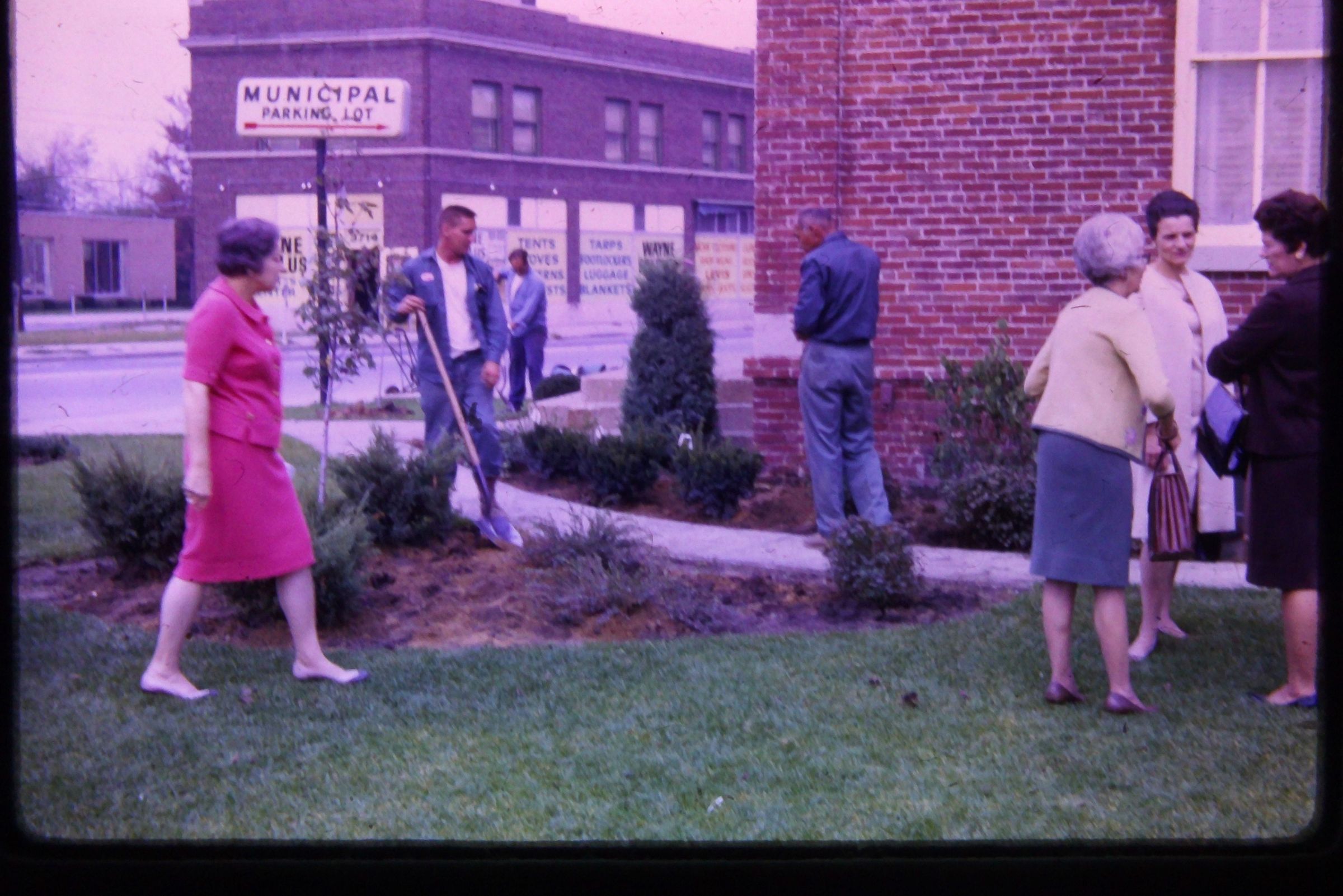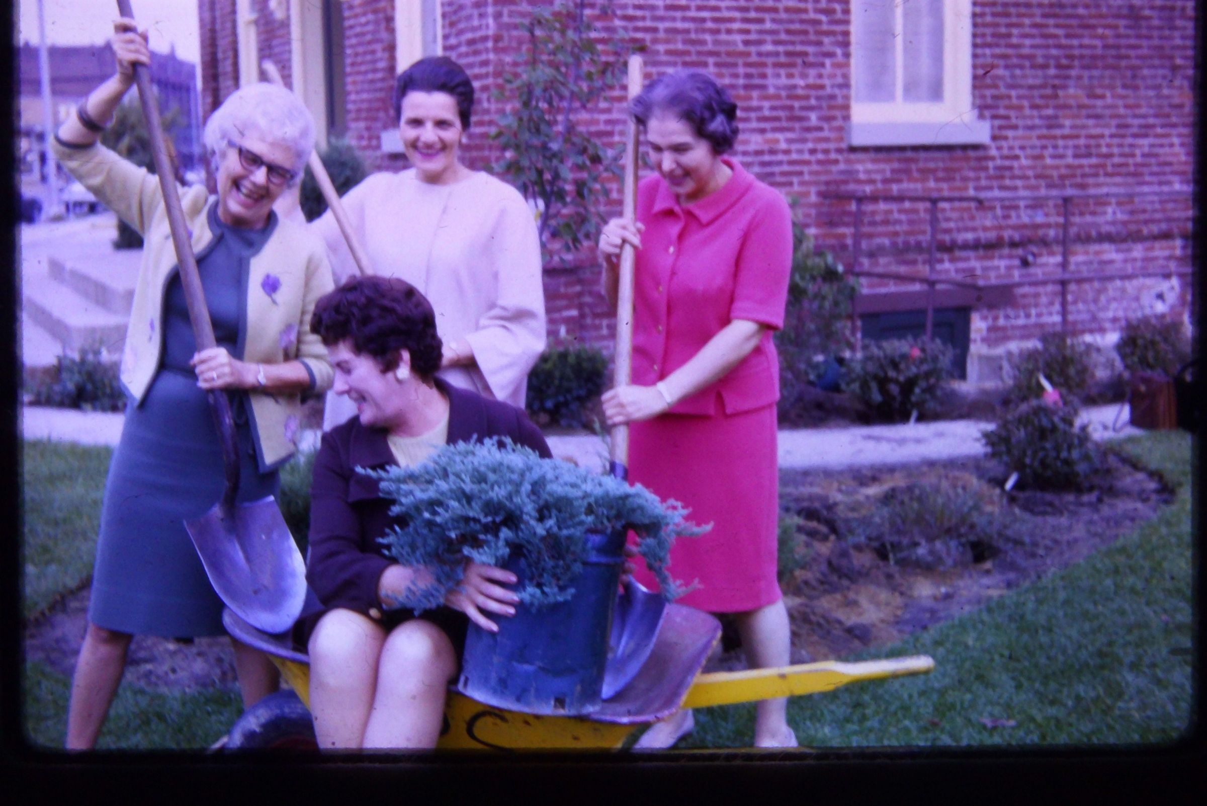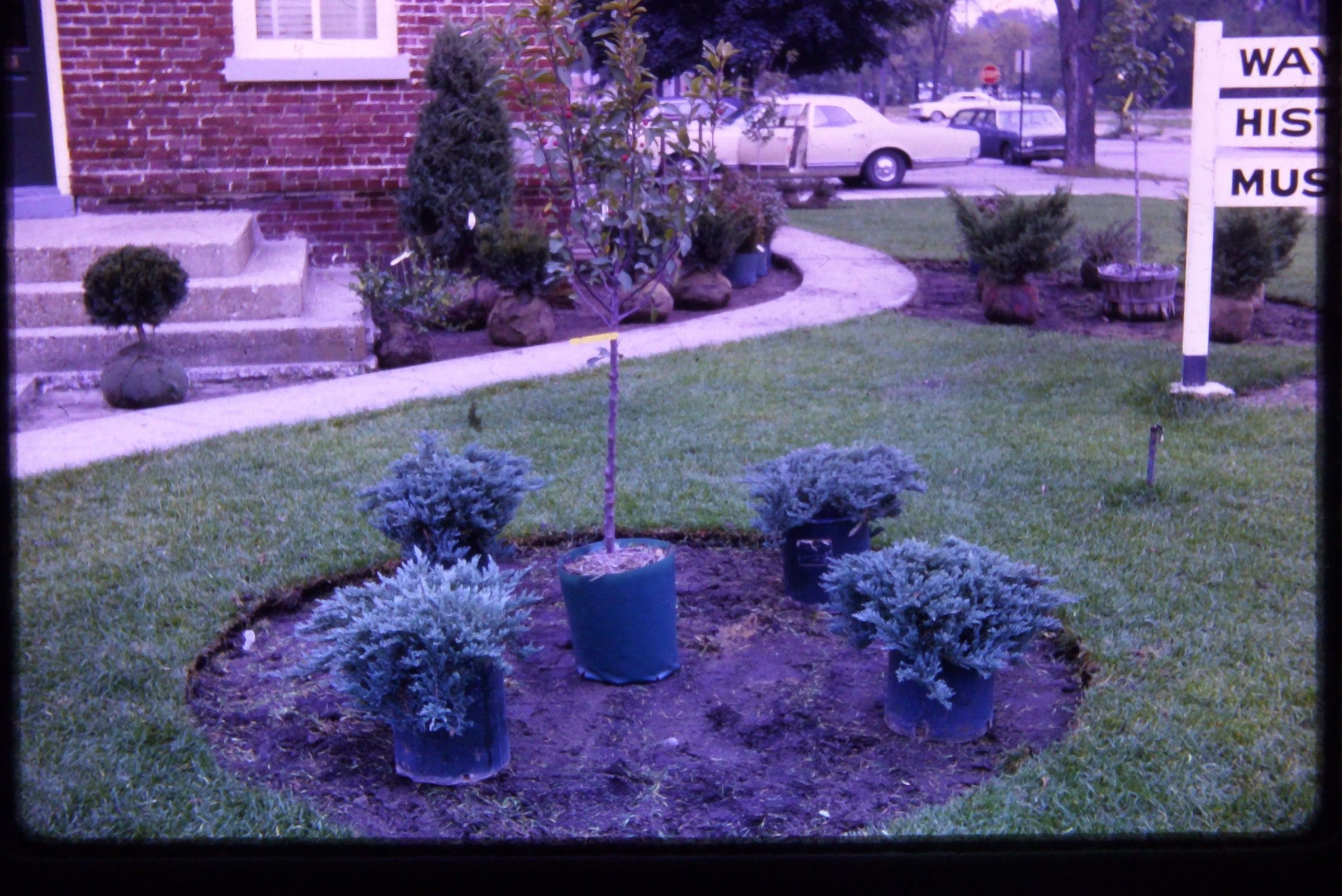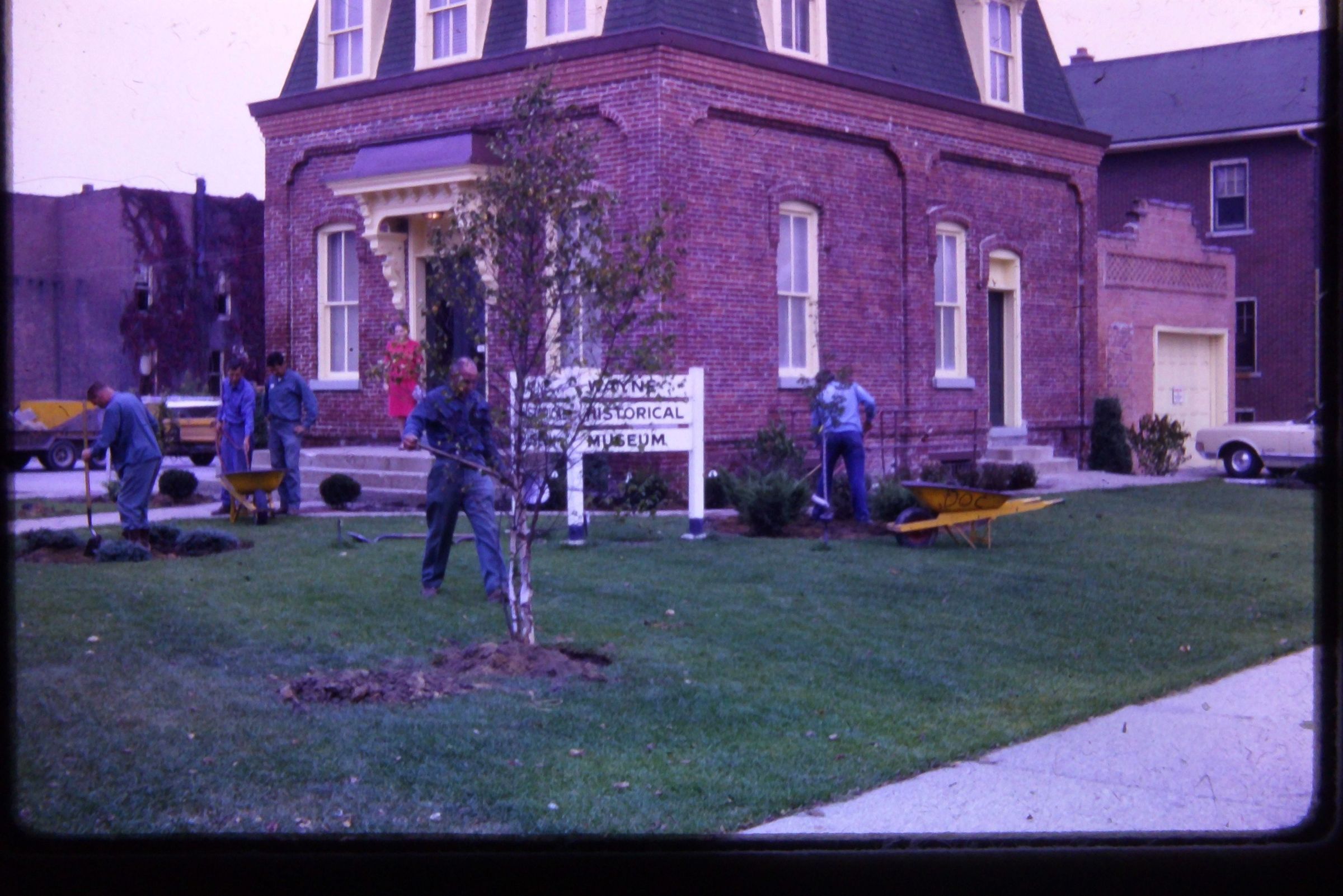 Mildred Hanchett, Marion Downes, Lorraine Ujda and Peg Bird with Wayne Historical Museum Sign in 1968.