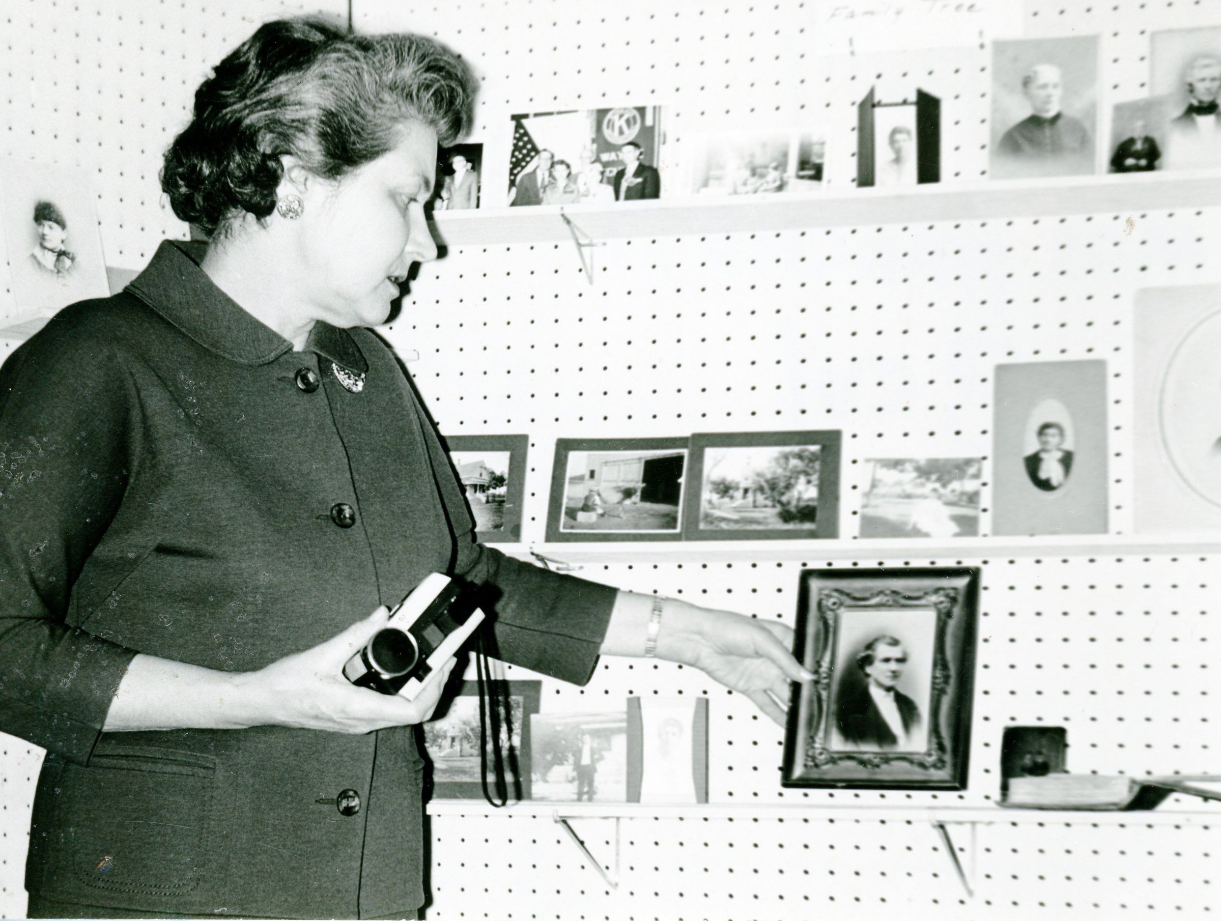 Mildred Hanchett pointing to a picture of Mr. Arzeno, the grandfather of Mrs. Estelle Bunting. He served in legislature. Mrs. Hanchett was being the speaker for The Greater Wayne Historical Society meeting. Photo taken on March 1966.Cataloged By