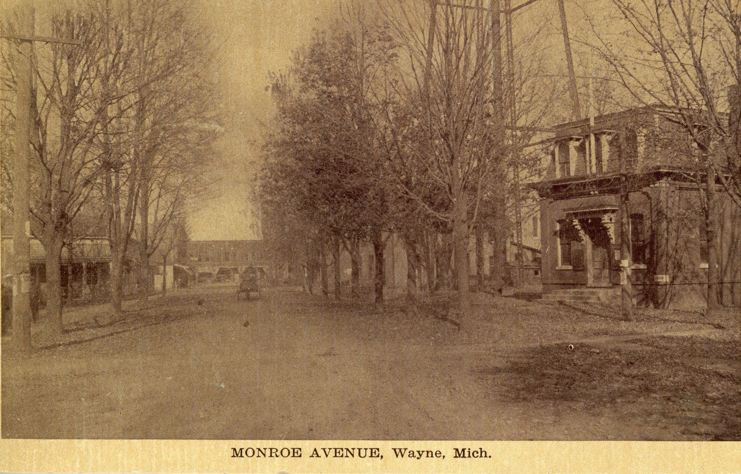 Monroe looking North from Main. Village hall at right. Water tower legs visible.