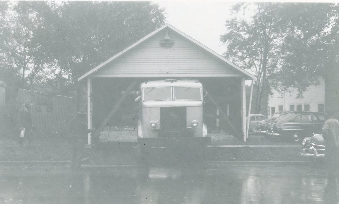 Raining on Oct.4, 1949. Garage moving to school location, lighted field.