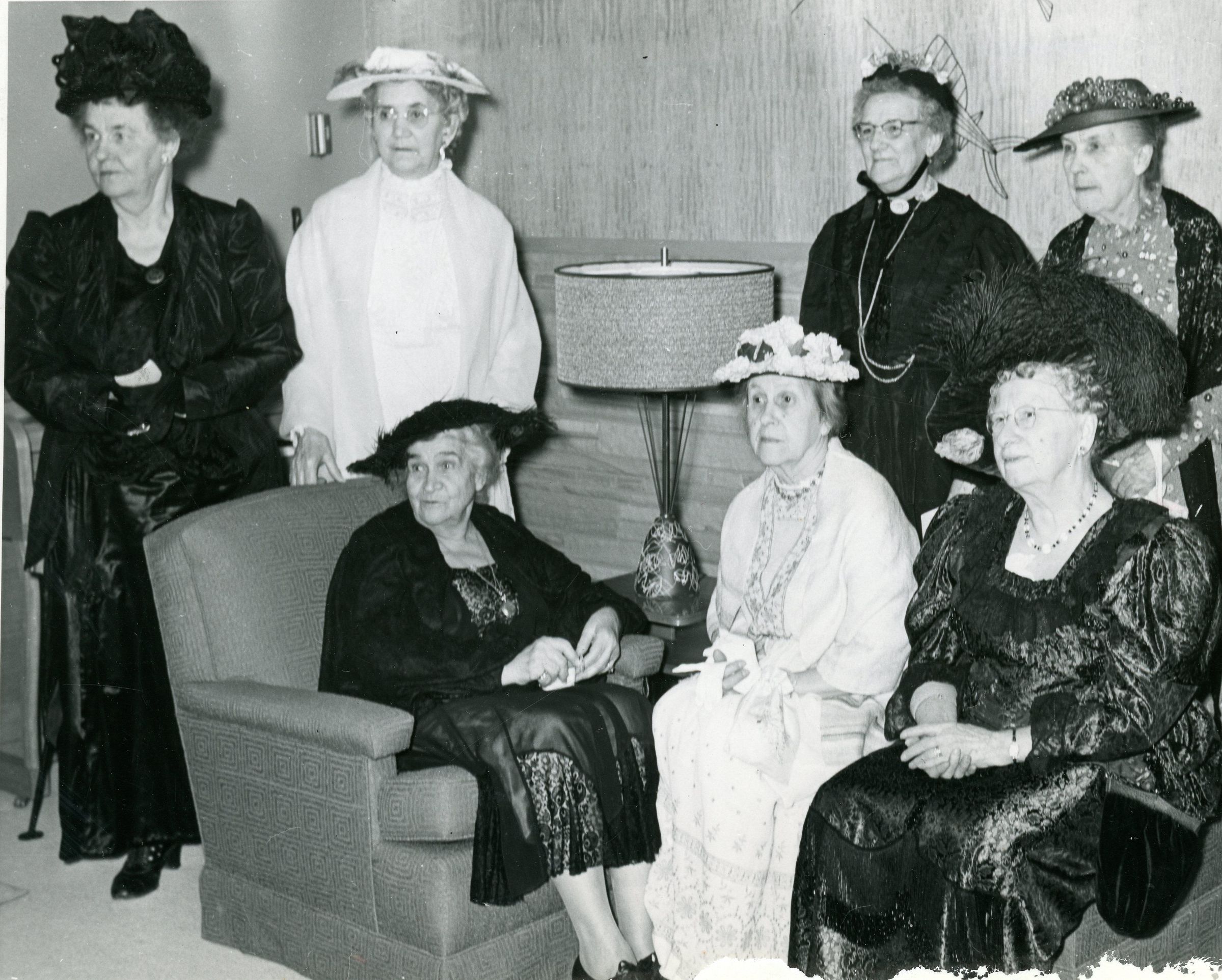 L-R: Estelle Jamieson (standing), unknown, Eliz Stellwagon (seated), Mildred Handyside (seated), Anna Cady Butler (standing), Mrs. Fred Hoops (seated), Estelle Bunting (standing)