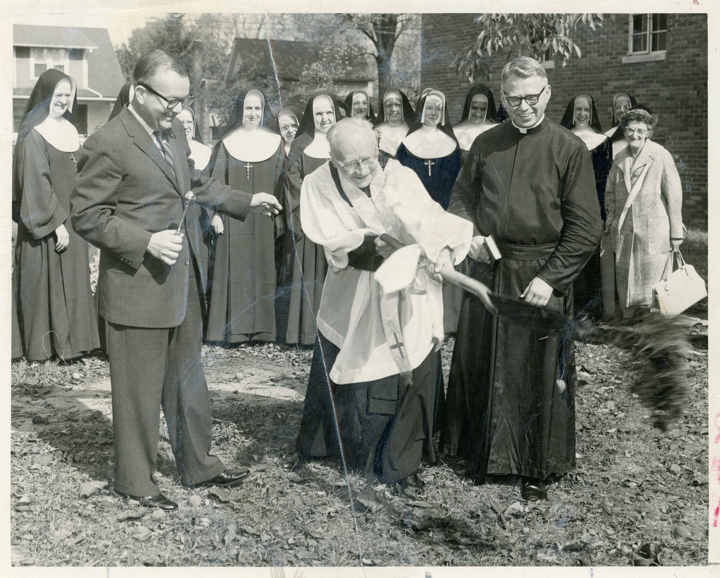 Groundbreaking for new Rectory. Fr. Haney with Shovel. Nuns. 1960