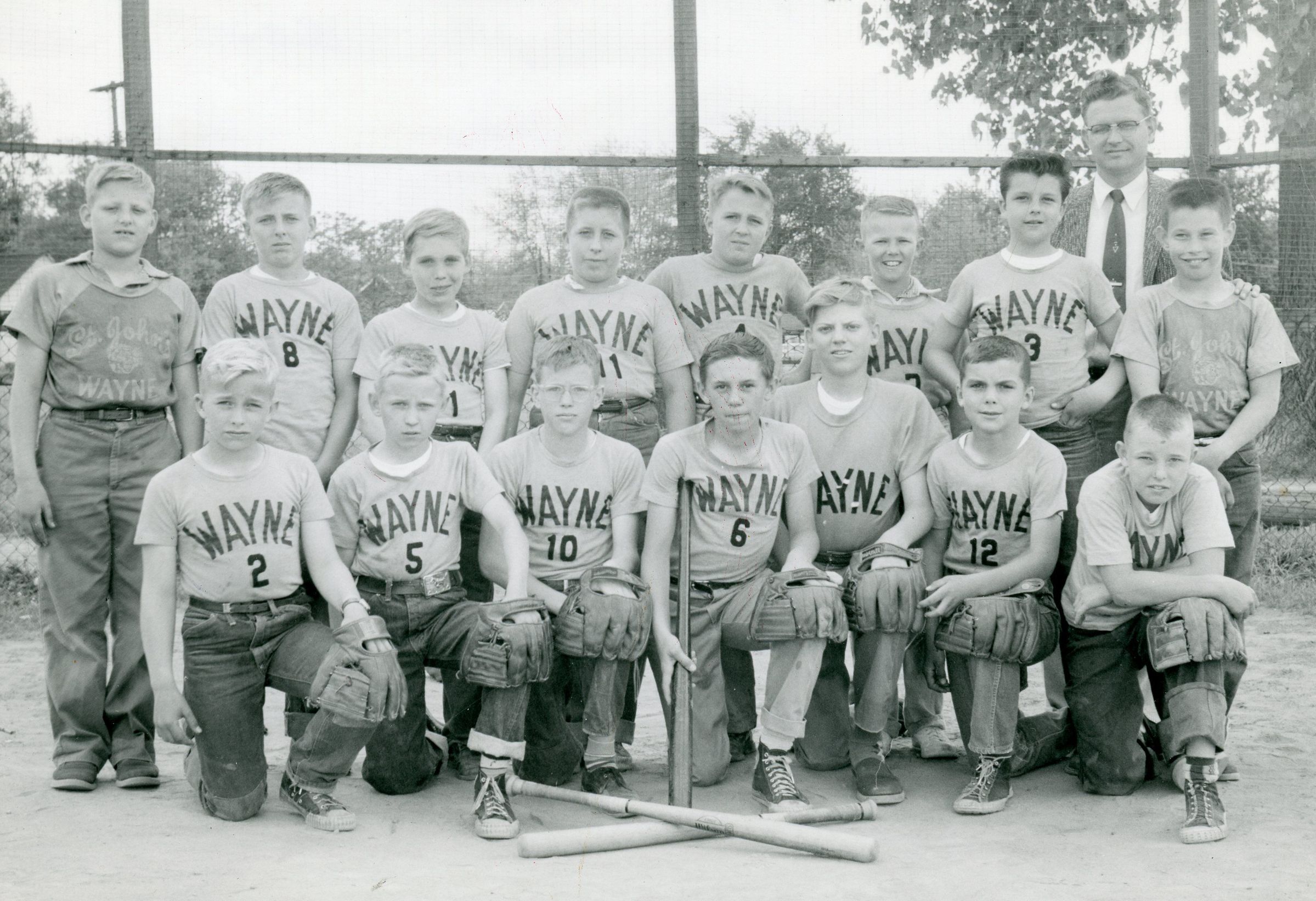 St. Johns Lutheran School baseball team 6-11-1958. South League Champs. Back Row: Robert Snell, Bill Boyer, Ernest Kehrer, Roger Marcotte, Reinhard Erdmann, John Mach, Darrel Rowe, Mr. Fuhrmann - Coach, Dean Naley. Front Row: Kent Bates, Jerry Kaiser, rodney Ott, James Vincent, james Snell, Jerry Eicholtz, Larry MachCataloged By