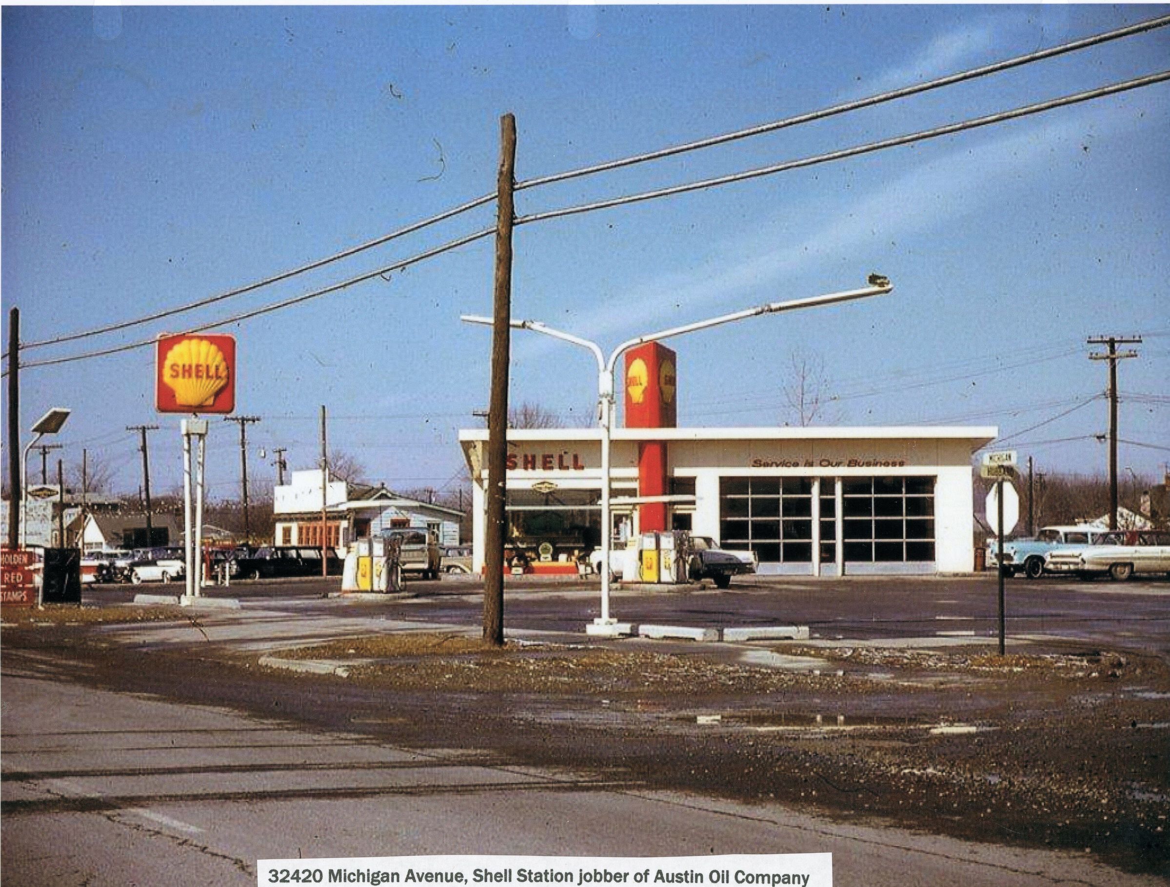 32420 Michigan - Shell Station. NW corner Michigan and Hubbard. Building still there as of 2024, remodeled.