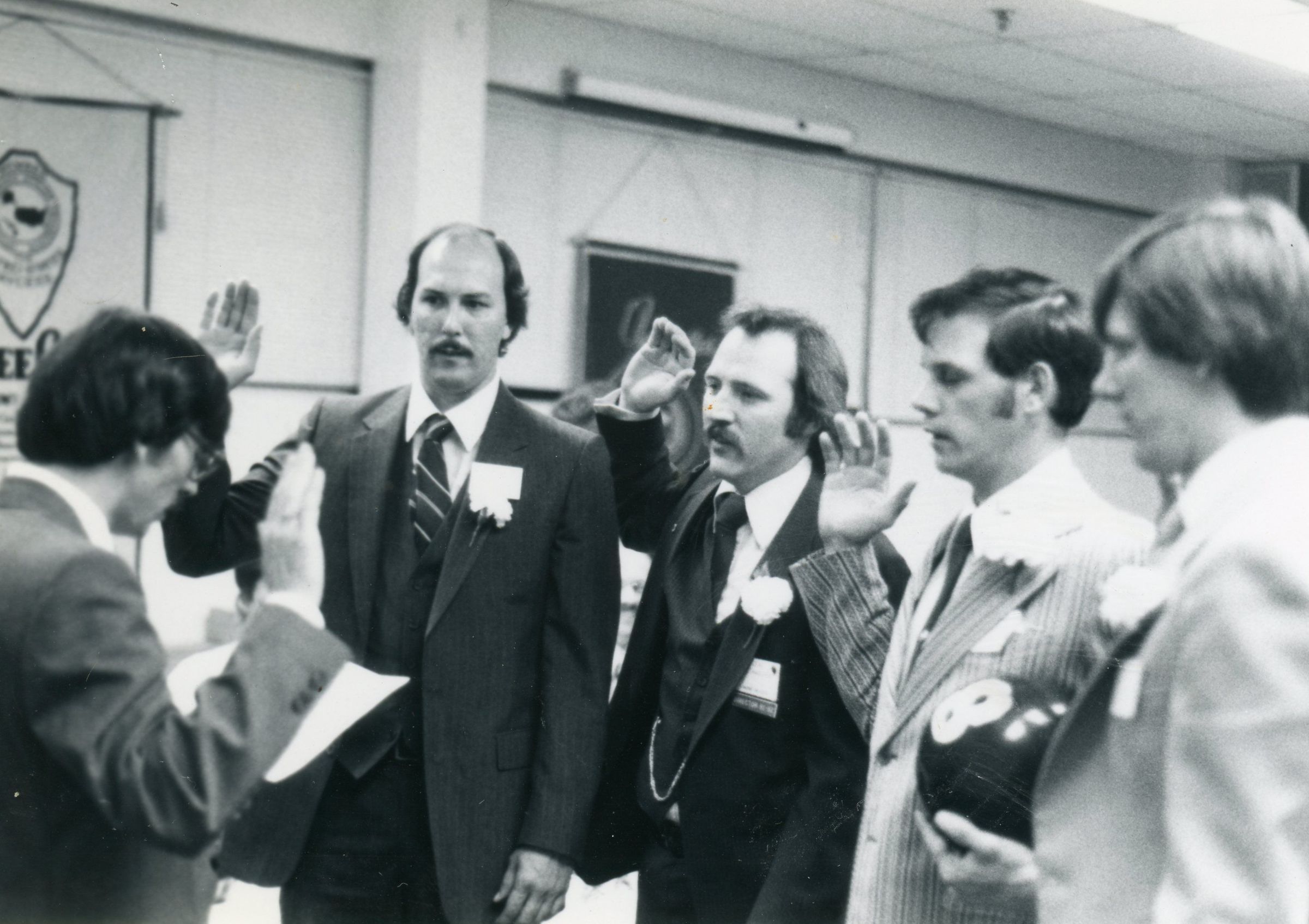 Dan Smith, president of Wayne Jaycees, swearing in officers Roqer Moore, Gene Osteabder, Randy Dittio, and Jen Jayne - Vice president.Cataloged By