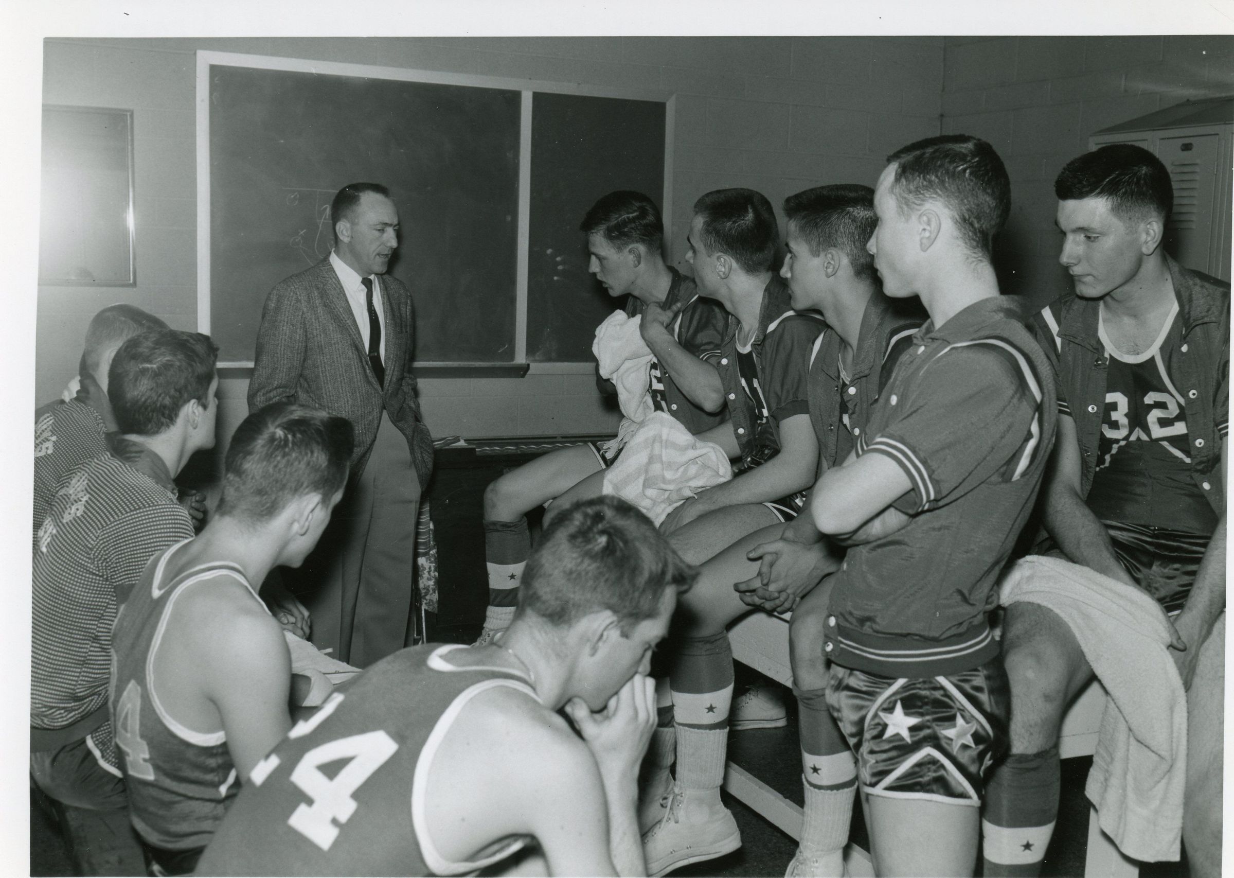 Boys Basketball. Locker room talk from coach Lentine during playoffs at U of D Stadium.