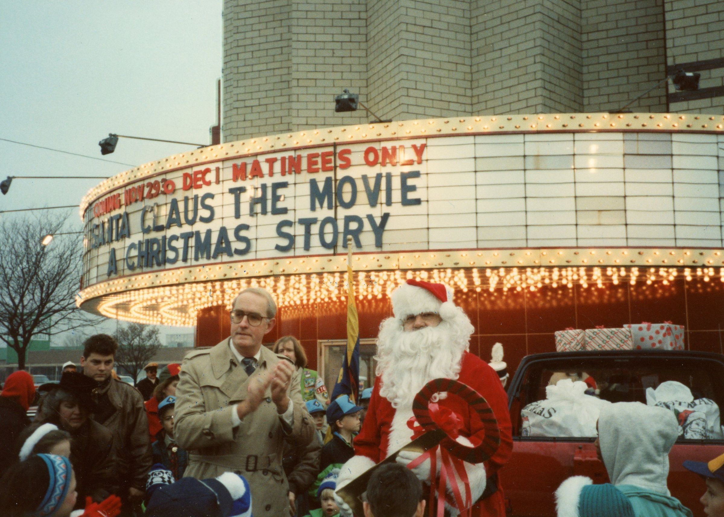 Exterior of State Theatre. Christmas Party. Santa