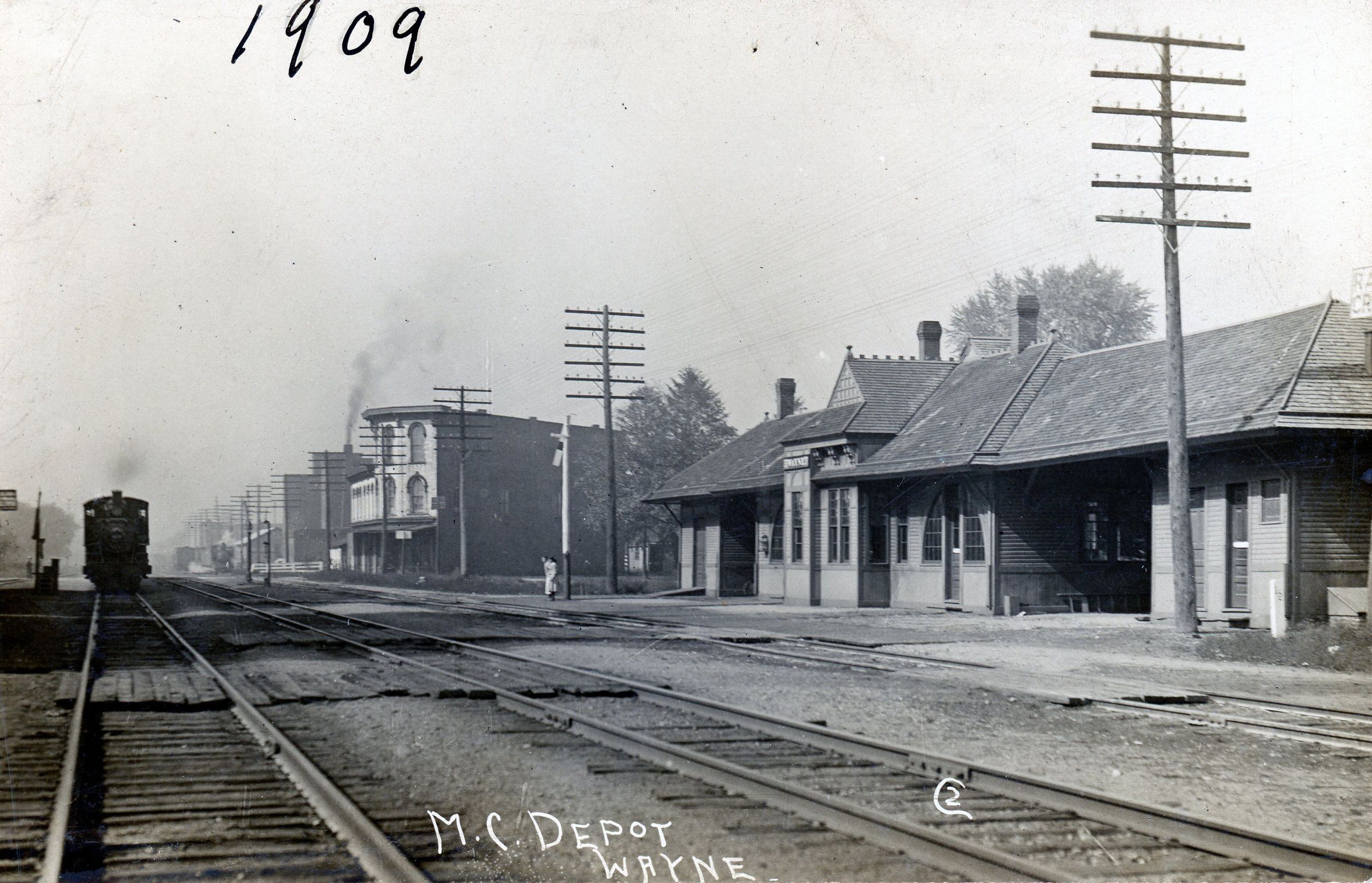 Wayne Railroad Depot and Steers Building. Wayne Road intersection, looking west. 1909