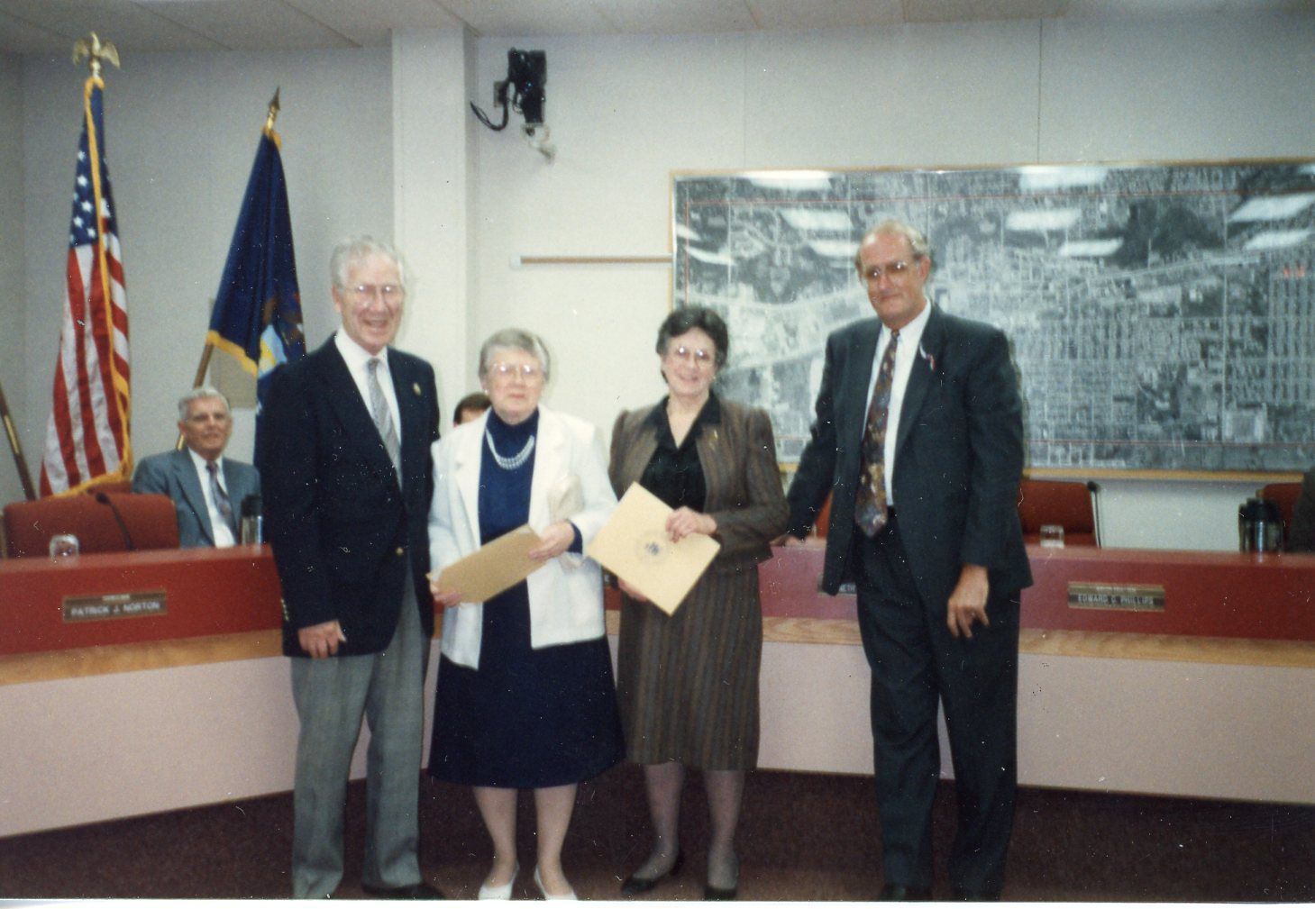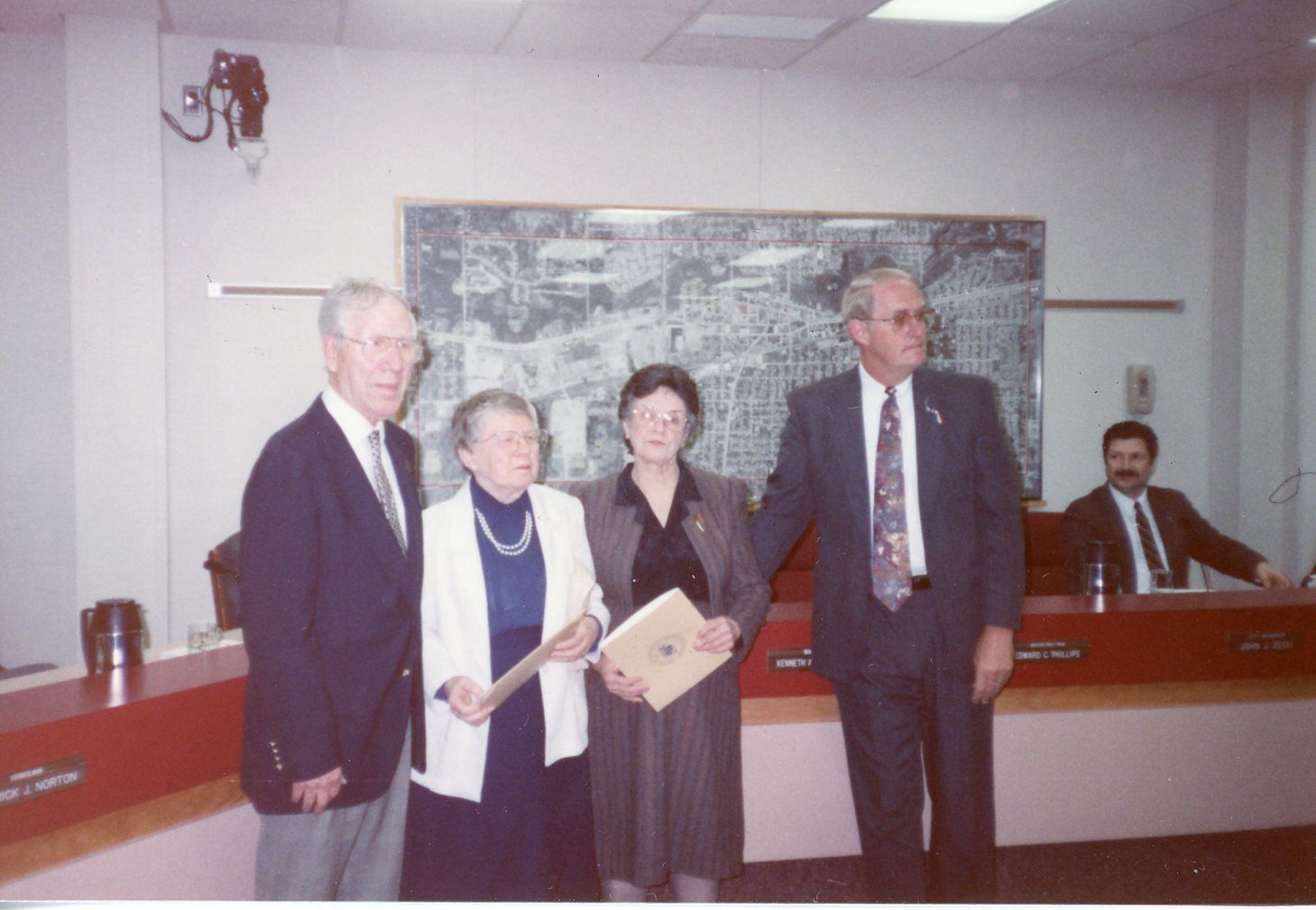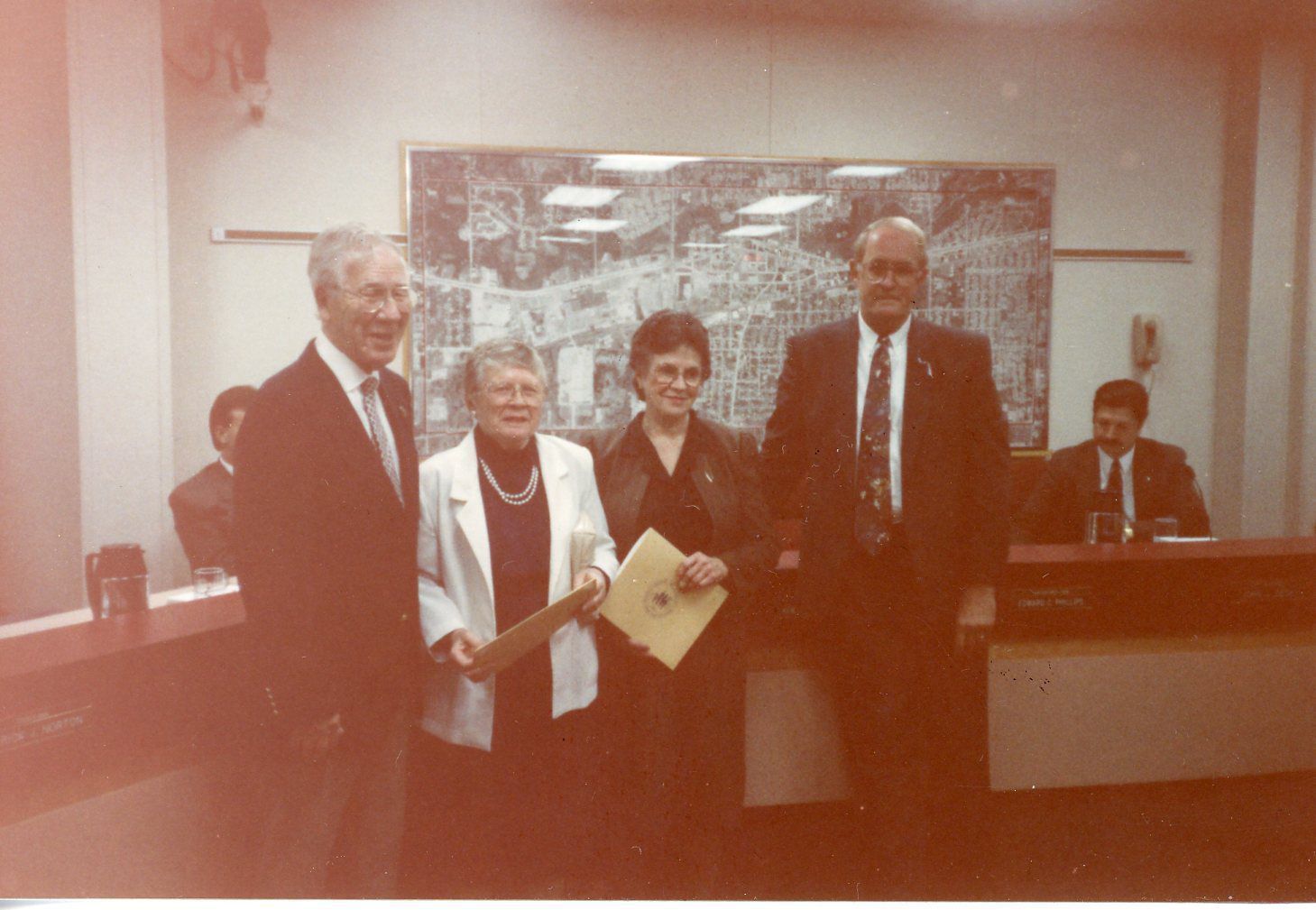 Ann Koch and Virginia Presson receiving Volunteer Plaques. Hank Goudy is on the very Left and Mayor Pro-Tem (Mr. Phillips is on the right. Photo was taken on Tuesday, April 20, 1993.Cataloged By