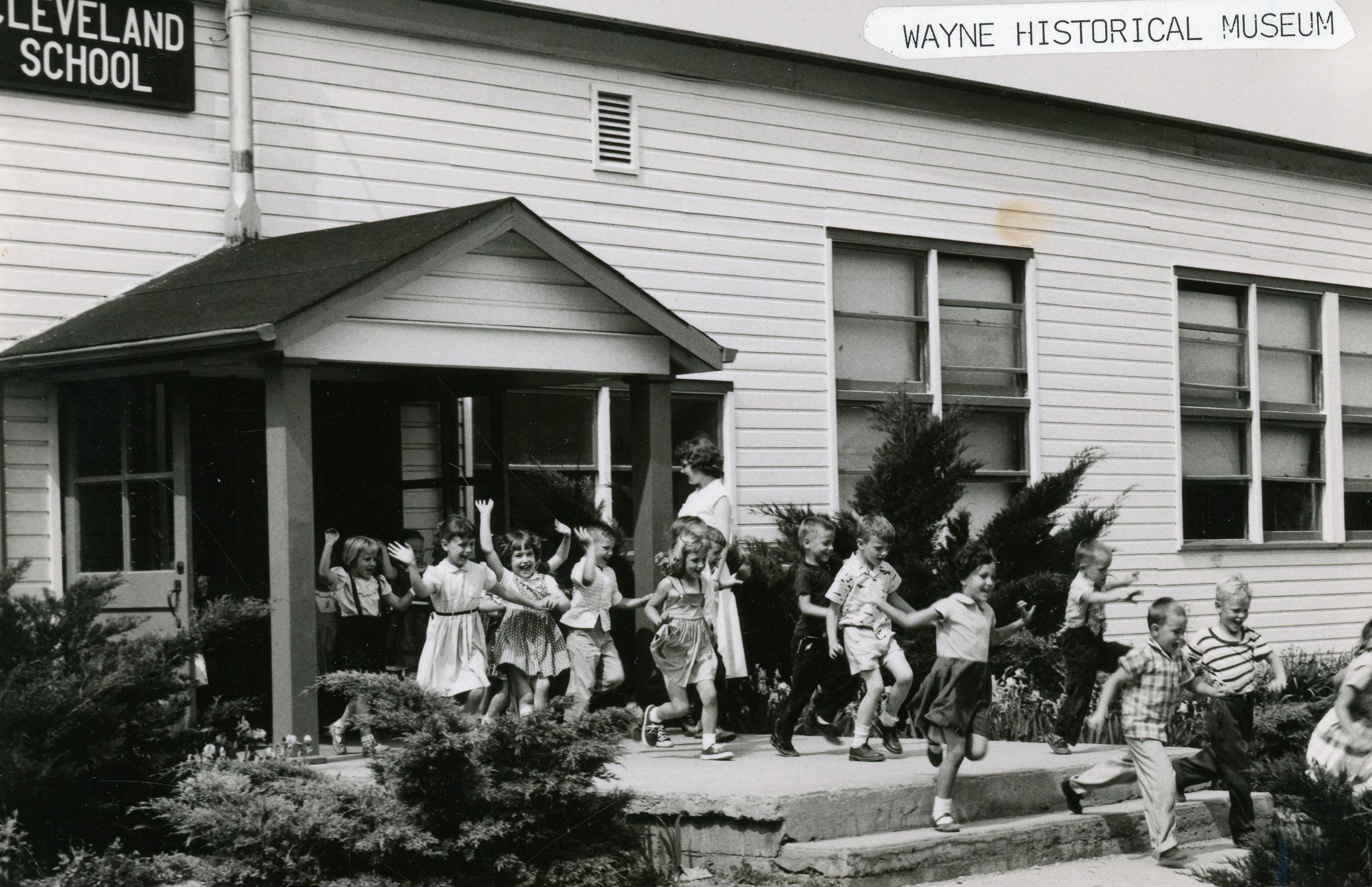 Cleveland School. NE corner of Palmer and Wildwood. Building was part of Willow Run during WW2, moved to Wayne to act as temporary school. Burned in November 1976.