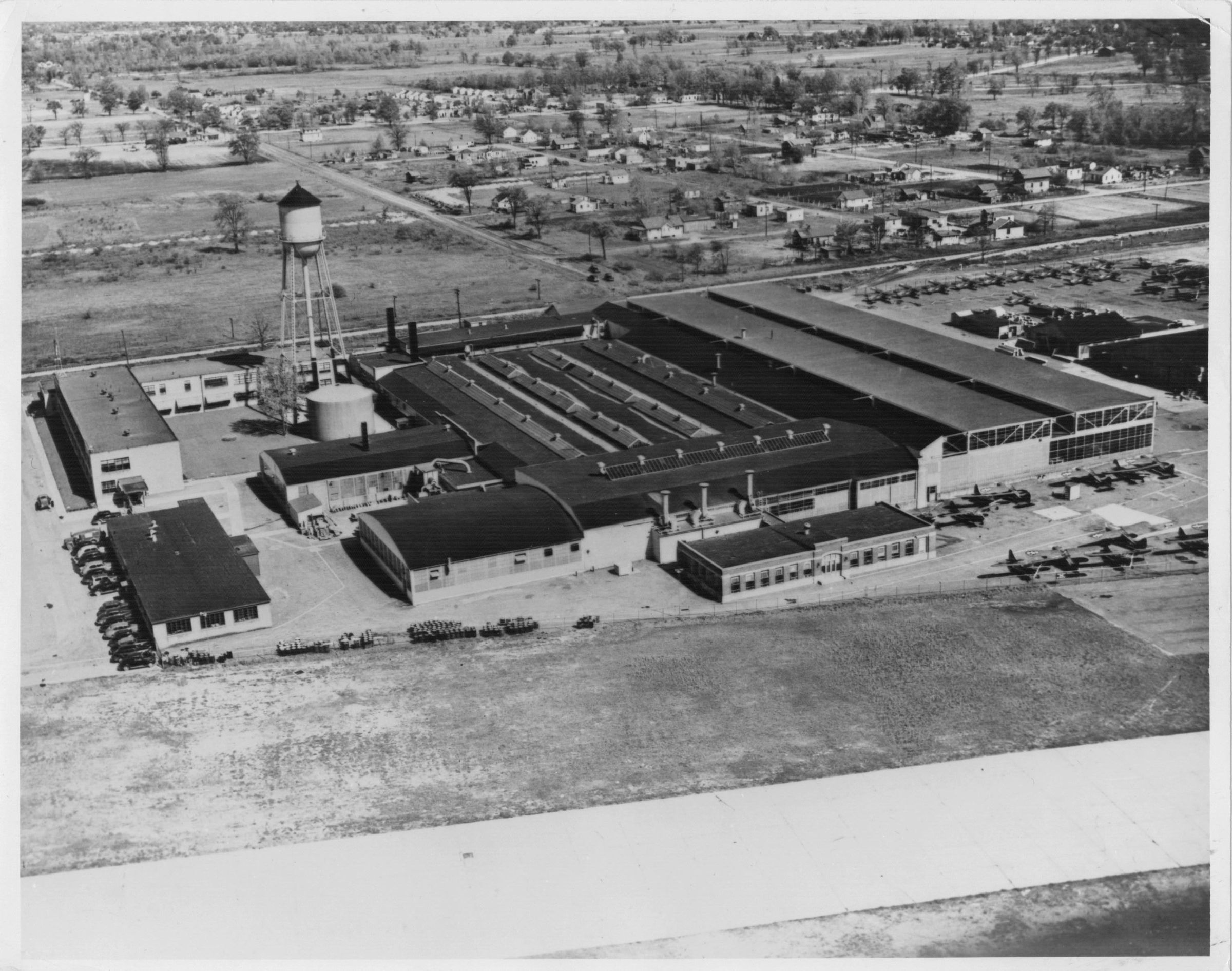 Stinson Aircraft Corp. in Wayne, Michigan looking West. The Stinson Factory was at the Detroit-Wayne Industrial Airport that ran along Van Born, Ecorse and Cogswell Roads and the Pere-Marquette railroad.Cataloged By