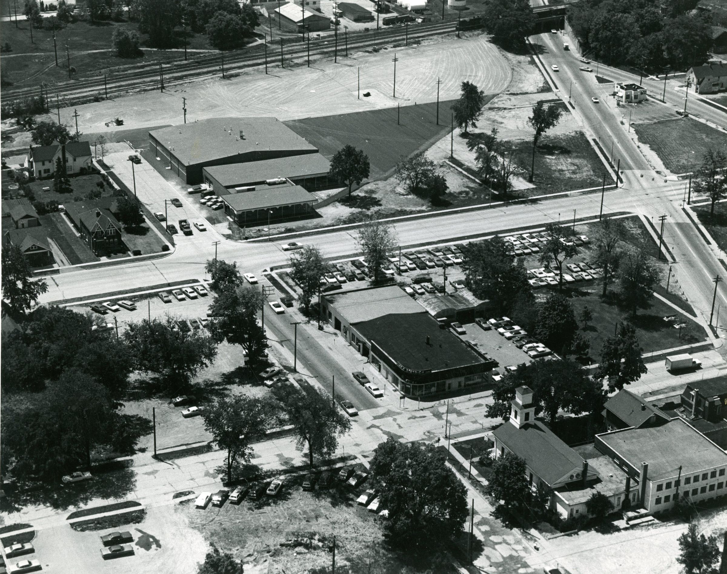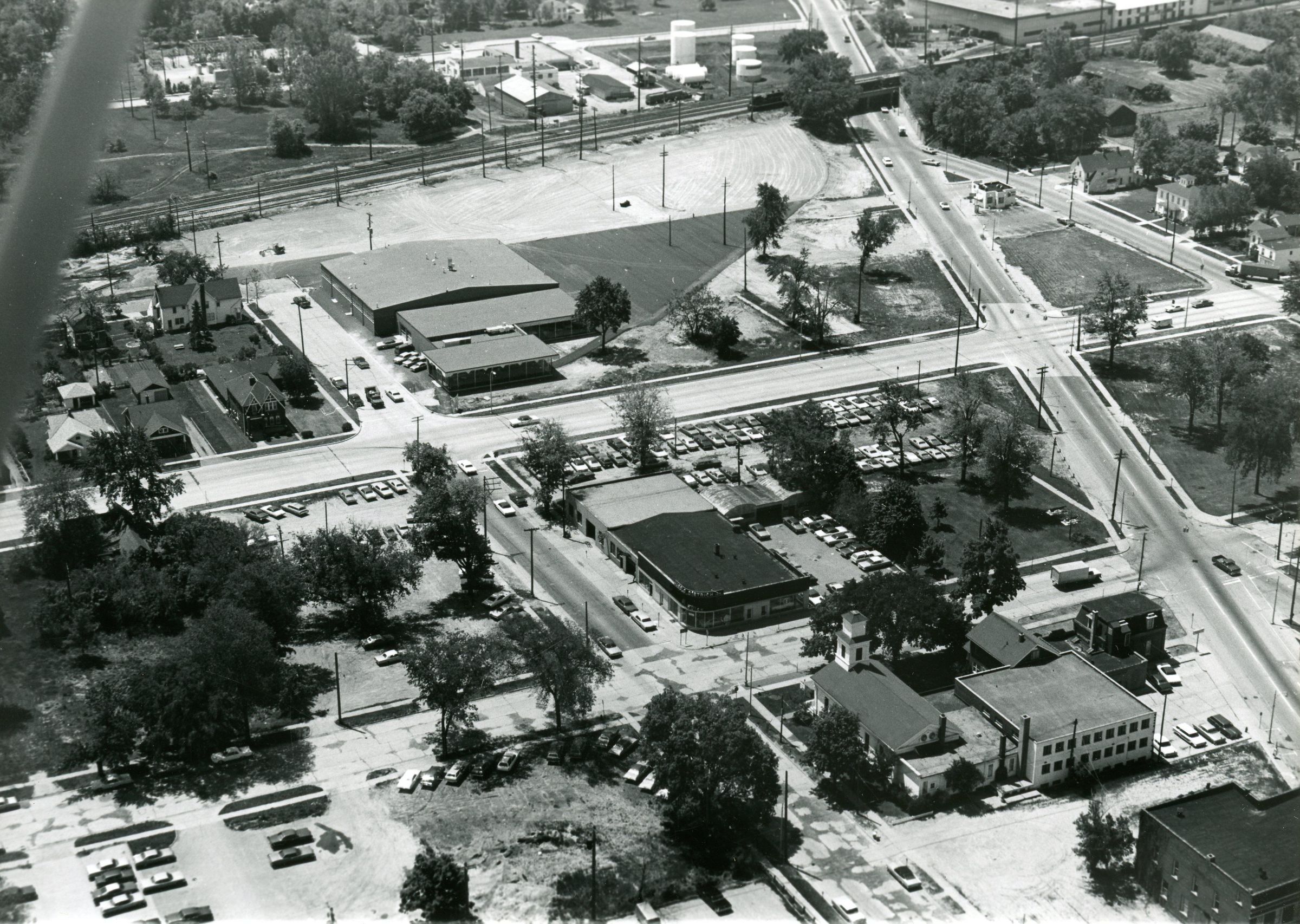 Monroe St. looking SW. 1968. Norris has been widened into Michigan Ave. EB. Congregational Church and Village Hall/Museum in bottom right. COnstruction on the Wayne road curve would start soon after this photo was taken and Monroe was removed.Cataloged By