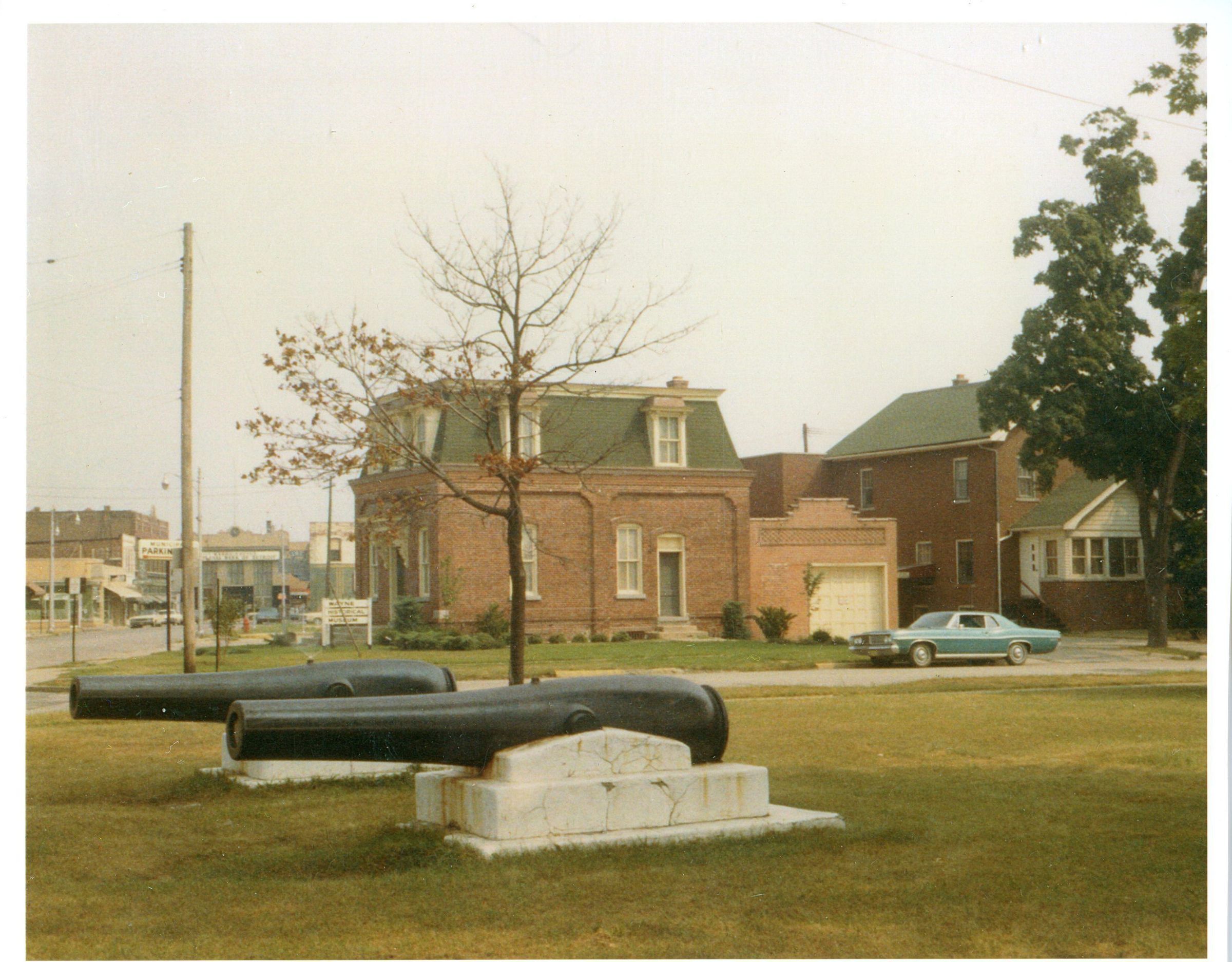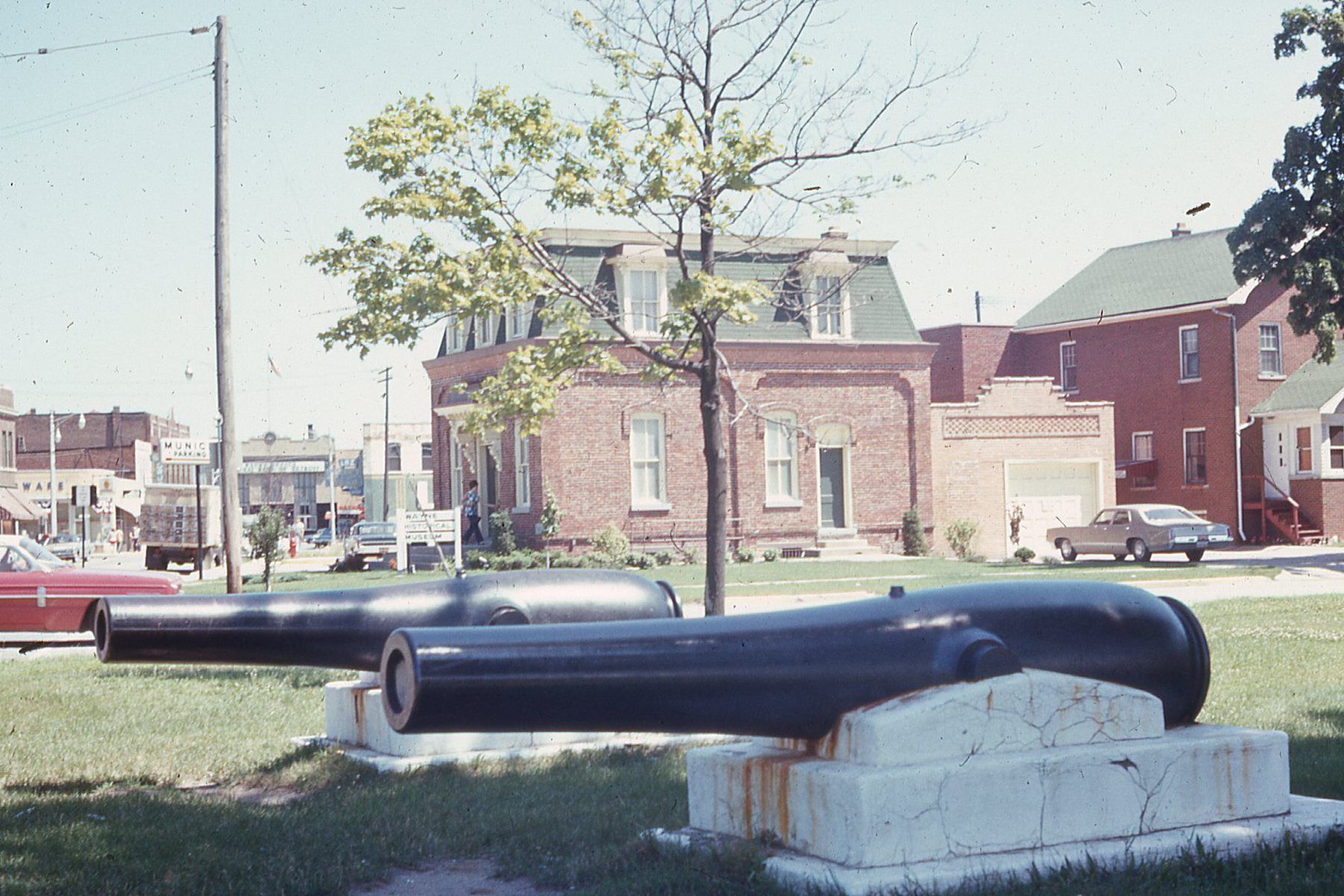 Village Hall as museum, Cannons, Village Park, Congregational Church Parsonage (35122 Main) at right. Monroe and main street
