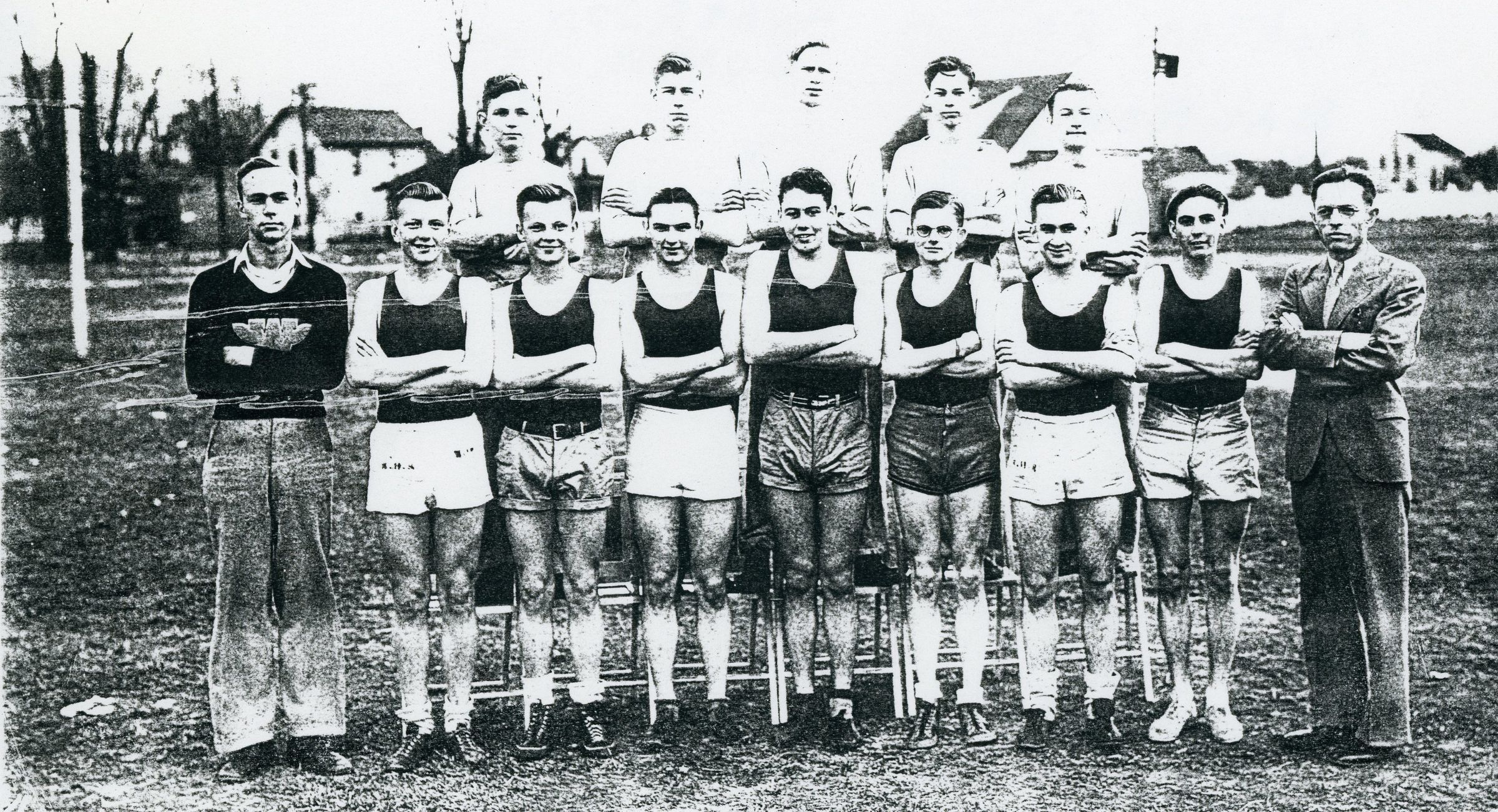 Wayne High School Track Team. Front Row L to R: Rebentish, Frank, Frank,?, Handyside, Sotzer, Morton, Smith and Coach Anderson. Back Row L to R: Courtney, Horton, Letson, Ballard and Sotolif.Cataloged By